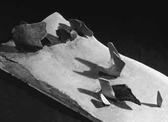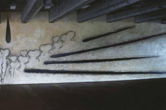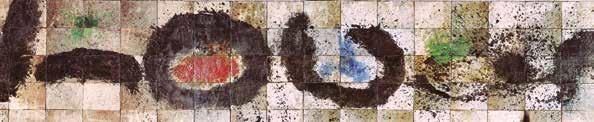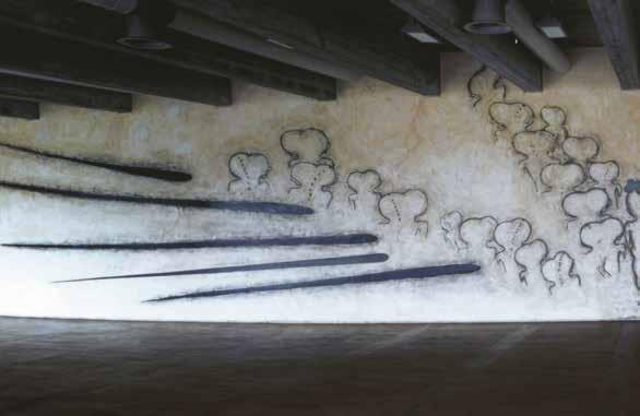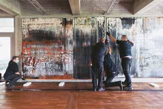 technique at close range. A self-reflecting landscape dissolves when you stand directly in front of Richter’s painting into a complex structure of countless layers of paint. A first glance from afar sees Soulages’ immense brushstrokes but, on closer inspection, they turn out to be a matter of minutely controlled, millimetre precision. His black calligraphy-like symbols create a connection with the signs in Joan Miró’s tiled frieze. With each of our steps, Alexander Calder’s (intrinsically moving) mobile changes, just as Gottfried Honegger’s pliages then become to the viewer a constant work in progress. This effect reaches the most intense variant in Felice Varini’s anamorphosis.
