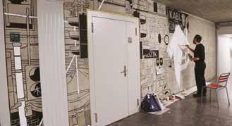 in interstices, passages, and corridors, or to direct collaboration inside the building. While the beholder of the artwork mostly spots only sections, the eye finds it difficult to grasp the big picture.