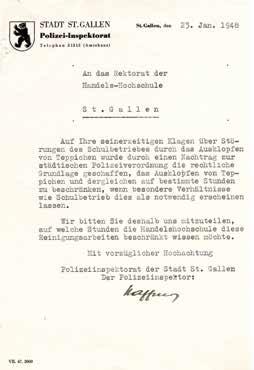 Die wirtschaftliche Erholung sollte erst nach dem Ende des Zweiten Weltkriegs einsetzen. Nun war es vor allem der Dienstleistungssektor, der mit Banken und Versicherungen Arbeitsplätze schuf, wenn auch die Stickerei nach wie vor die Haute Couture in Paris mit Materialien belieferte. Die Krise der Stadt schlug sich auch in den Studierendenzahlen der Handelshochschule nieder: 1917/18 waren noch 243 Studierende immatrikuliert, diese Zahl sank 1919/1920 auf 156. Mit 111 Studierenden war 1939/40 der Tiefpunkt erreicht, ab dann ging es aufwärts: 1949/50 waren es bereits 403 Studierende, 1963/64 war die Zahl mit 1 114 Studierenden zum ersten Mal vierstellig. Seither geht der Trend, von kleineren Schwankungen abgesehen, beständig nach oben. Derzeit sind mehr als 9 000 Studierende an der HSG immatrikuliert, und es ist nur eine Frage der Zeit, bis die Zahl fünfstellig wird.