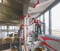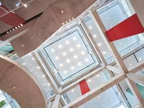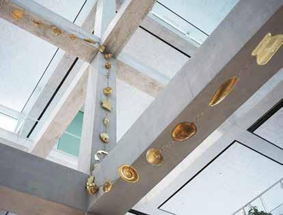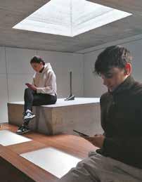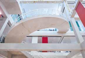 zonen, während in den oberen Geschossen flexible Räume für Lern- und Pop-upVeranstaltungen angeordnet sind. Die Struktur des Innenraums ist geprägt vom regelmässigen Betonstützen- und Balkenraster – um eine homogene und lichte Wirkung zu erzielen wurde der Beton mit einem hohen Anteil an Weisszement aufgehellt. Im Blick nach oben nimmt die stilvoll gestaltete Metalldeckenverkleidung Bezug zur Tradition der Stickerei und schafft einen subtilen Kontrast zum «Open Grid». Aufgebaut auf einem einfachen, quadratischen und klaren Raster gestattet die offene Struktur verschiedene flexible Interpretationen der Raumabfolgen und dynamische Zonen, die Unterstützung bieten für Adaption, Interpretation und Kombination. So entstehen bis zu 15 modulierbare Räume in unterschiedlichen Grössen auf drei Ebenen, die verschiedene Qualitäten aufweisen und interaktive Begegnungen