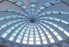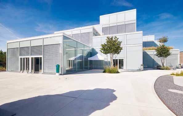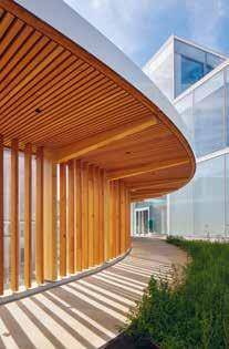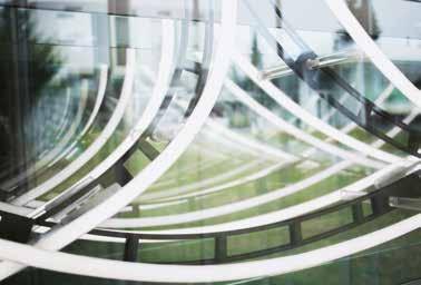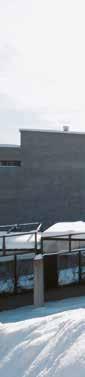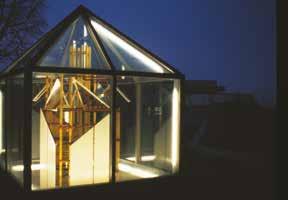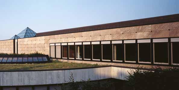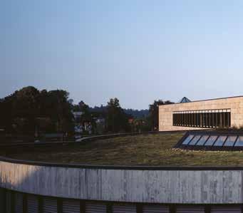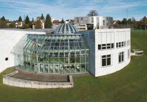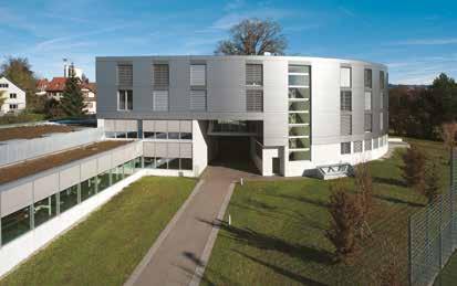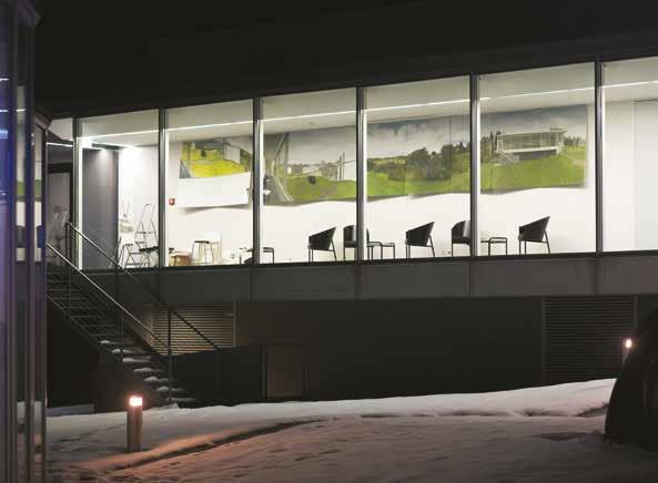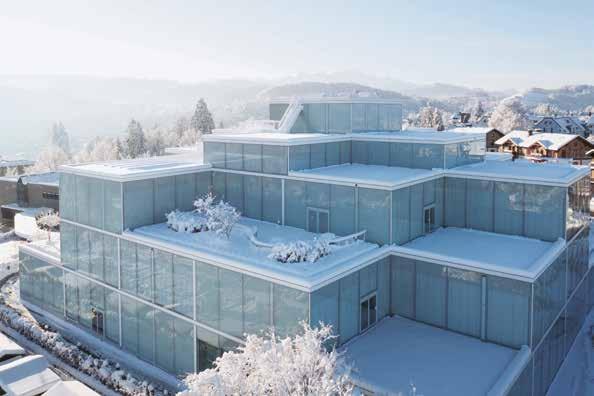 fördern. Die grosszügigen Verglasungen stellen einen Bezug zwischen Innen- und Aussenraum her und unterstützen die Leichtigkeit der Architektur. Die Wirkung des Gebäudes wechselt im Tagesverlauf: