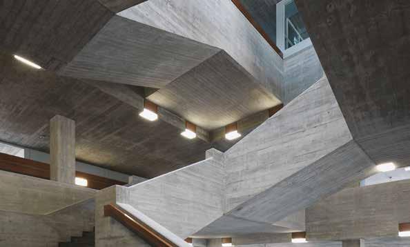 Vom Umfang und der Komplexität dieser Aufgabe ahnt man heute kaum mehr etwas, wenn man das skulpturale Hauptgebäude mit seinen durch zahlreiche Freitreppen und Plätze verbundenen Nebentrakten in neuem Glanz erstrahlen sieht. Dem inzwischen als Baudenkmal klassifizierten Campus wurde bei allen Anpassungen an die veränderten Anforderungen höchster Respekt gezollt und seine Substanz erhalten – bis zum sorgfältig restaurierten Förderer-Originalmobiliar, dessen Stücke allesamt die äussere Form des Gebäudes widerspiegeln. Die durch Schmutz und Verwitterung verdüsterte Aussenhülle zeigt sich nun in einer hellen, überaus freundlichen Anmutung, so dass die Finessen der Architektur – wie etwa die Akzentuierung der Wandstruktur durch die feine Streif ung der Fugen der Schalungsbretter – erst wieder richtig zur Geltung kommen können. Das helldunkle Schattenspiel der