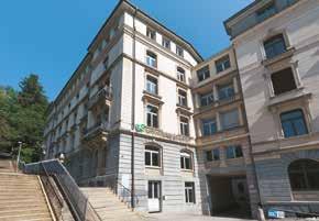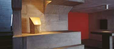 Innenhofs in einen lichtdurchfluteten Raum, der ihm unvermutet den Ausblick in die Weite der Landschaft bietet, denn talseitig bildet eine grosszügige, über beide Stockwerke geführte Glaswand den Abschluss des Foyers. Die weiss gestrichenen Wände, der helle Steinboden, die Glasfront und die Wasserbecken unter den zwei im Bogen geführten Treppen verleihen dem grossen Aufenthaltsraum eine elegante Atmosphäre.
