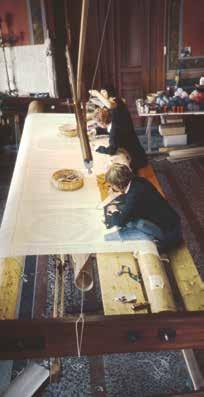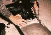 (wie die schwarzen Stimmkreise auf den indischen Tabla-Trommeln) und zeichnet mit Rohrfeder und Chinatusche Handlinien darauf. Die stille Arbeit schafft eine kontemplative Atmosphäre und setzt die Haptik der Hände der universitären, digitalen Arbeit entgegen.