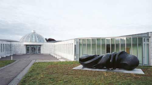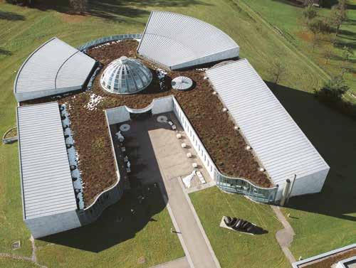 Erinnerungen an ein «spätmodernes Gartenschlösschen» hat das WBZ schon erweckt, und tatsächlich wirkt die unter einer Glaskuppel im Grünen an einen Hügel geschmiegte Zweiflügelanlage heiter wie die Pavillonarchitektur in einem englischen Park. Die Lage mit grossem Umschwung ermöglicht, wie schon beim Hauptgebäude, auch den Aussenraum ins Kunstkonzept miteinzubeziehen.