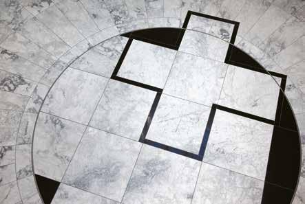 Analog dem Bibliotheksgebäude sind die Aussenwände mit Natursteinplatten verkleidet, doch mit dem heller gewählten Stein – einem weiss geflammten Marmor «Bianco Savanna» – stellt sich eine neue, erhabene Stimmung ein. Diese Stimmung setzt sich fort, wenn man vom Eingang her direkt in den Bereich des zweistöckigen Foyers unter der zentralen Glaskuppel gelangt, welche in Dialog mit der Pyramide des Bibliotheksgebäudes tritt. So gelangt der Besucher von der Intimität des