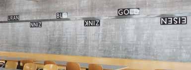 Free-Flow-Buffetbereich durch Einbau eines Zwischenbodens auf einer zweiten, mit dem Erdgeschoss des Hauptgebäudes niveaugleichen Ebene, zusätzlich Seminarund Gruppenräume Platz. Die Speisesäle sind auf die alte Turnhalle, die ehemalige Garderobe und den Geräteraum verteilt und durch eine unterschiedliche Farbgebung gekennzeichnet. Im grossen Saal mit rund 300 Sitzplätzen sorgt helles Umbra für eine ruhige Stimmung; Englischgrün bietet den Hintergrund für den kleineren Saal mit etwa 85 zusätzlichen Plätzen; und dunkles Bordeauxrot lässt den abgetrennten Barbereich zu einem stimmungsvollen Aufenthaltsort werden. In allen drei Räumen setzt elegantes Mobiliar in dunklen Holztönen farblich und formal klare Akzente. Die bestehenden Bauteile in der Architektursprache von Förderer, Otto und Zwimpfer wurden sorgfältig ins neue Konzept integriert und in ihrem ursprünglichen Ausdruck belassen,