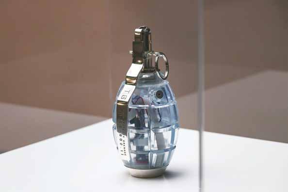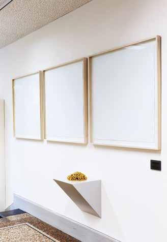 konfrontiert zunächst Studierende und Mitarbeitende im Eingangsbereich der Tellstrasse mit vergoldeten Oberflächen von Patronenhülsen aus Keramik und führt mit drei gerahmten Tableaus die Stereotypen über Mexiko ad absurdum. Den Preis von 10’000 mexikanischen Pesos für jede der Tafeln legte Rebolledo unabhängig von Galerien, Zweitmärkten oder Spekulationen fest: Das entspricht den Kosten für 25,06 g Kokain, dem mexikanischen Mindestlohn von 169.262 VSM (Veces Salario Mínimo) oder 625 Patronen, Kaliber 7,62 (AK-47 Automatikgewehr). Diese mit dem Auge kaum