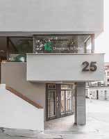 erinnert mit dem abgestaffelten Volumen an eine asymmetrische, geometrisch abstrahierte Pyramide mit Gipfeln, Plateaus, Nischen und Dachterrassen, bei dem jeder Würfel durch seine transparent oder opak verglaste Fassade klar erkennbar bleibt und dennoch zu einem raffinierten Ganzen wird. Durch die volumetrische Staffelung fügt sich das Gebäude sehr gut in das Wohnquartier ein, und es entstehen attraktive, differenzierte Aussenräume.