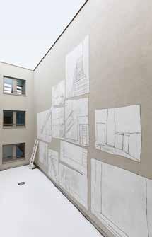 Die bekannte Schweizer Künstlerin Zilla Leutenegger (*1968) applizierte hier erstmals ihre Zeichnungen mit der neu erlernten Gestaltungstechnik des Sgraffito auf eine grosse fensterlose Hauswand in einem der vier Lichthöfe an der Müller-Friedberg-Strasse 8. Das Werk «Treppenhaus» erstreckt sich über drei Stockwerke. Die Künstlerin kratzte nach einer zeichnerischen Vorlage auf der Wandfläche die obere Putzschicht ab und legte so die darunterliegende, andersfarbige Schicht frei. Der karge, archaische Strich von Zilla Leuteneggers Zeichnungen geht dabei mit der Sgraffito-Technik eine ideale Verbindung ein.
