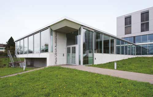 Architekten Lauener + Baer aus Frauenfeld hervor, die das sanft abfallende Terrain für einen teilweise in den Hügel versenkten Bau nutzten. Bei der komplexen Planung der Gesamtsanierung der HSG kam der neuen Sporthalle neben ihrer eigentlichen Bestimmung zuerst freilich eine besondere Aufgabe zu – im Hallenbereich fungierten drei freistehende Glaskuben in Stahlskelettkonstruktion von 2007 bis 2011 als Unterbringungsort provisorisch eingerichteter Seminarräume und Hörsäle und gewährleisteten so die Weiterführung des Lehrbetriebs unter den erschwerten Umständen der verschiedenen Bauetappen. Als gewissermassen «gebaute Landschaft» schmiegt sich das Gebäude an die Hügelkuppe. Aus der Ferne sind drei breite Fassaden- und Fensterbänder zu erkennen, die sich hinter dem vorgelagerten Rasensportplatz gestaffelt in die Höhe schieben, nur leicht über das Hügelniveau herausragend in die