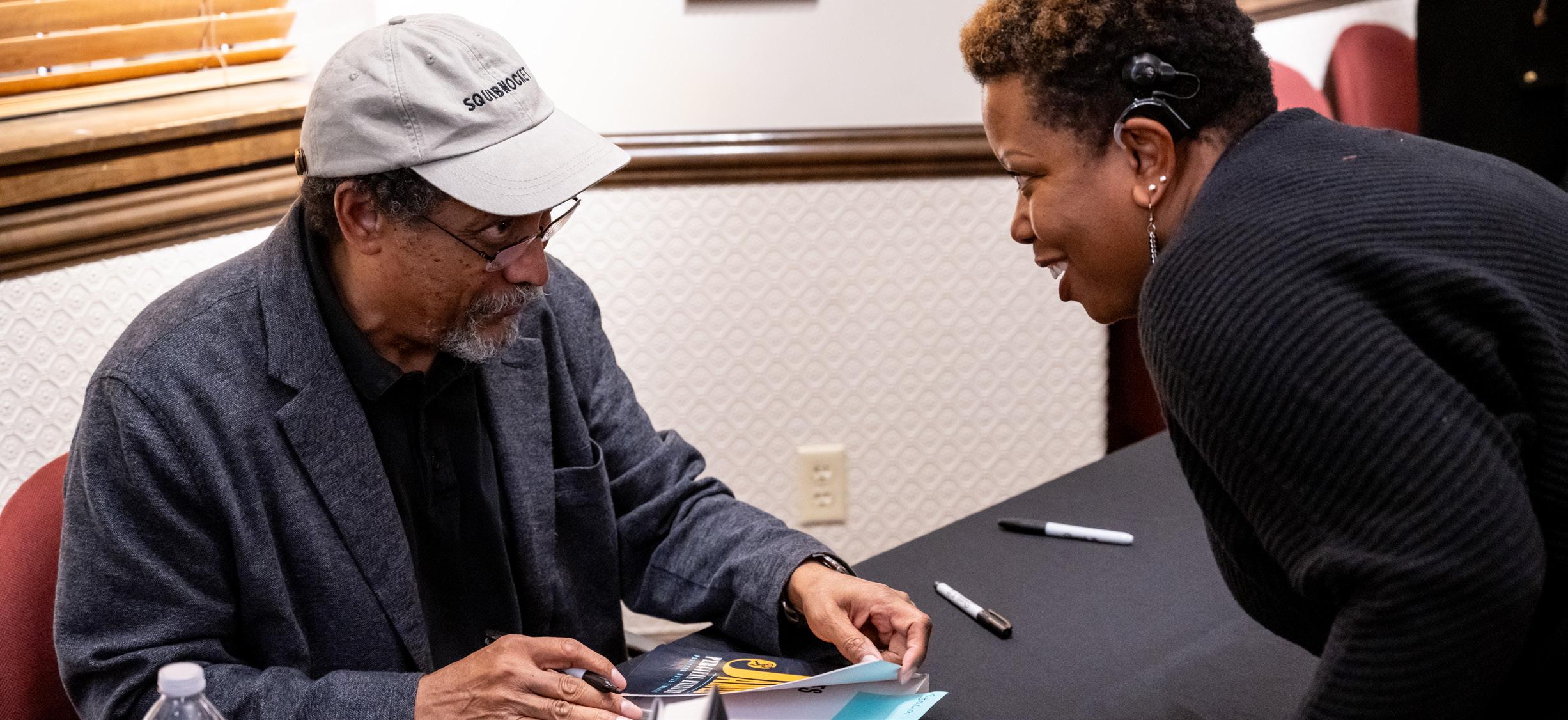 At his Tanner Conversation in Kingsbury Hall with Jeremy Rosen and Rone Shavers (English), Percival Everett (University of Southern California) discussed his 2024 novel, James, which retells Mark Twain’s Huckleberry Finn from Jim’s perspective. Everett described himself as “pathologically ironic,” yet clarified that “at the core of any irony is earnestness… a real love of something.” His interests span mathematics and philosophy, where “identity” is conceptual rather than demographic: “How is it that ‘A equals A’ is different from ‘A is A’?… When I start thinking like that, that’s when I know I’m working on something.” For James, he read Huckleberry Finn fifteen times until “thoroughly sick of it,” then wrote from memory.