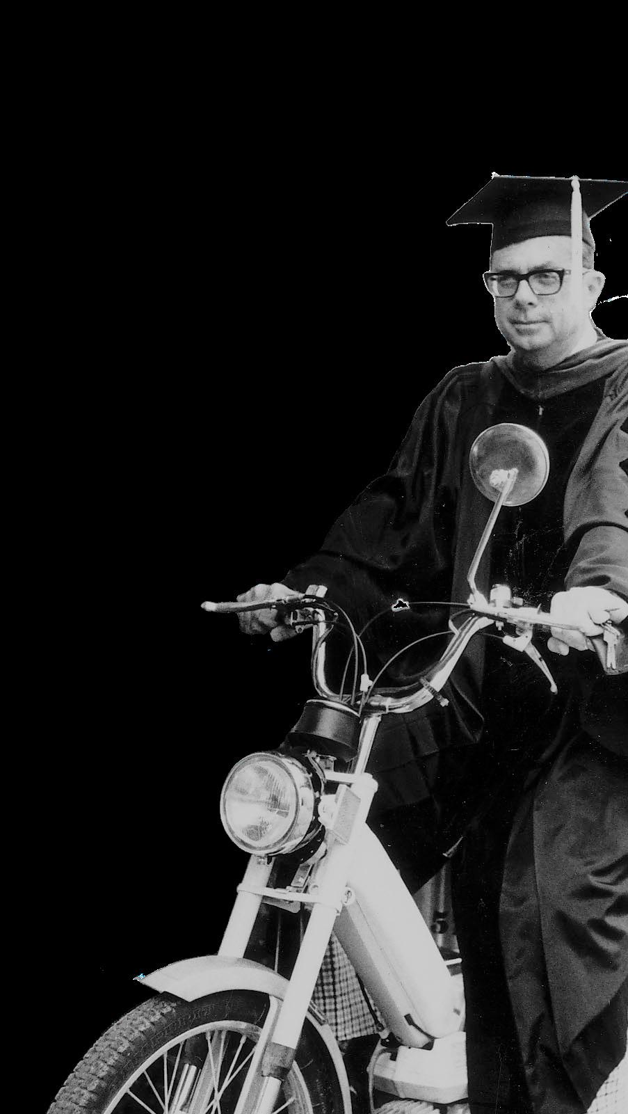 Tom Stritch rides a motorcycle on campus on graduation day in 1978.