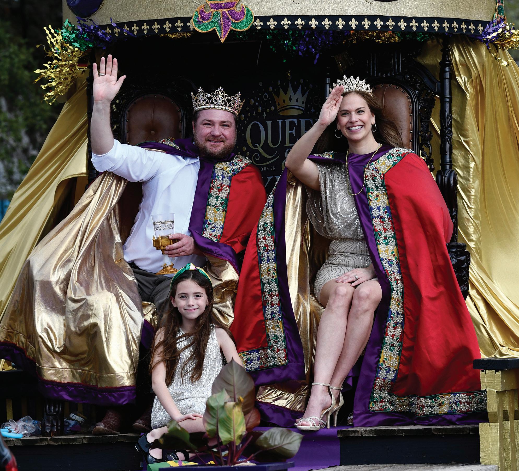 Mardi Gras King Jude Prather (left) and Queen Kathy MartinezPrather (right) ride with their daughter in the Annual Mistick Krewe of Okeanos San Marcos Mardi Gras Parade, Saturday, Feb. 14, 2026, in Downtown San Marcos. The Prathers were elected the 2026 King and Queen at the Twelfth Night Party.