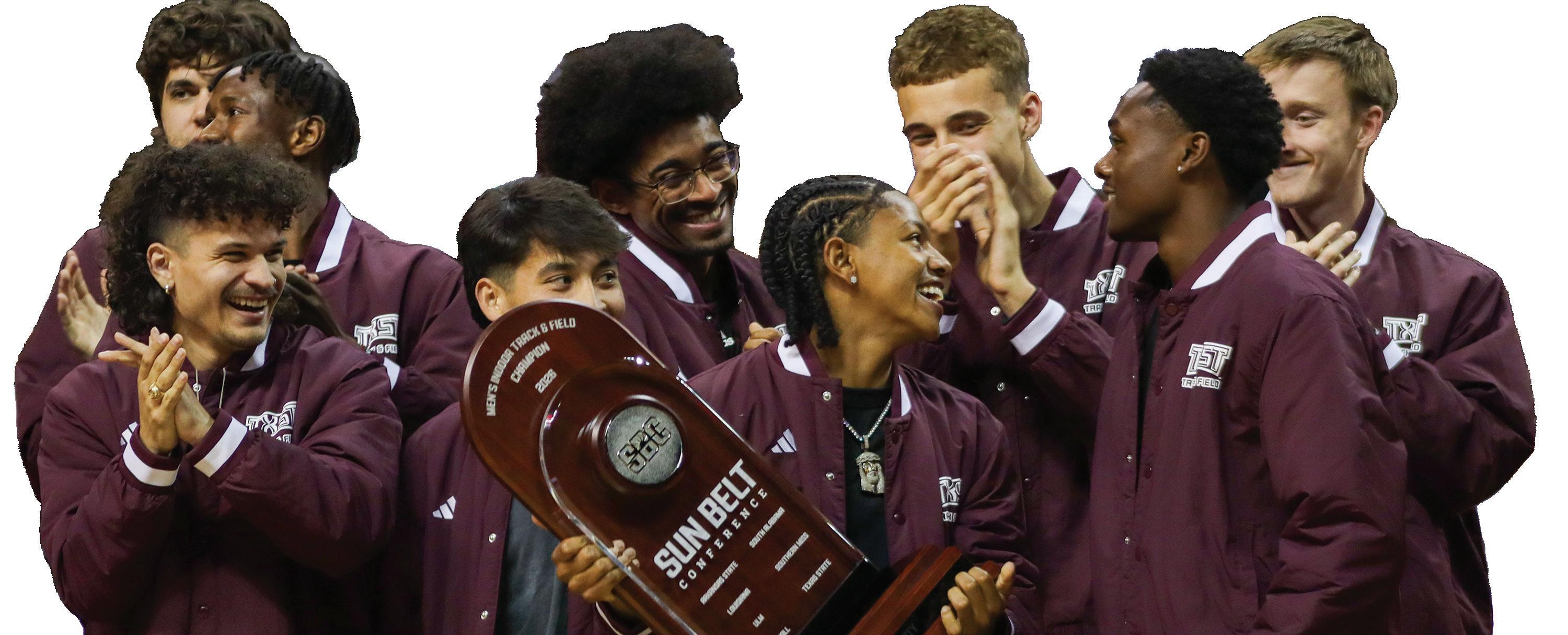 The Texas State Men’s Track and Field team celebrate winning the Sun Belt Indoor Track & Field Championship, Friday, Feb. 27, 2026, at Strahan Arena. The team was recognized during halftime at the men’s basketball game, along with the women’s team; the win marked the first time in program history that both the men’s and women’s teams won the Sun Belt Indoor Track & Field Championship concurrently.