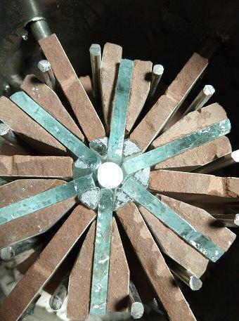 Unos cilindros de inox atraviesan estos agujeros y sirven para que mediante una rosca exterior y una maneta se pueda ejercer presión y trasladada la presión al interior ésta apretara las seis losetas de gres , las cuales presionaran las piececitas triangulares de vidrio haciendo de ésta manera que todas las alas de la estrella que confluyen en el centro del horno se fundan entre si He colocado en el centro de cada estrella una pieza de tiza redonda, después de conformada la pieza se retira la tiza y ya queda la pieza hecha con su agujero correspondiente. Naturalmente he tenido que respetar los tiempos de calentamiento y enfriado, con lo cual he podido (forzando un poco) hacer tres estrellas diarias.