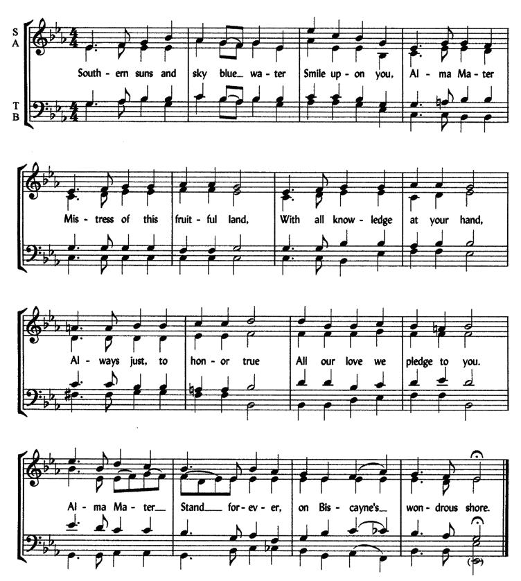 Southern suns and sky blue water, Smile upon you, Alma Mater; Mistress of this fruitful land, With all knowledge at your hand, Always just, to honor true All our love we pledge to you.