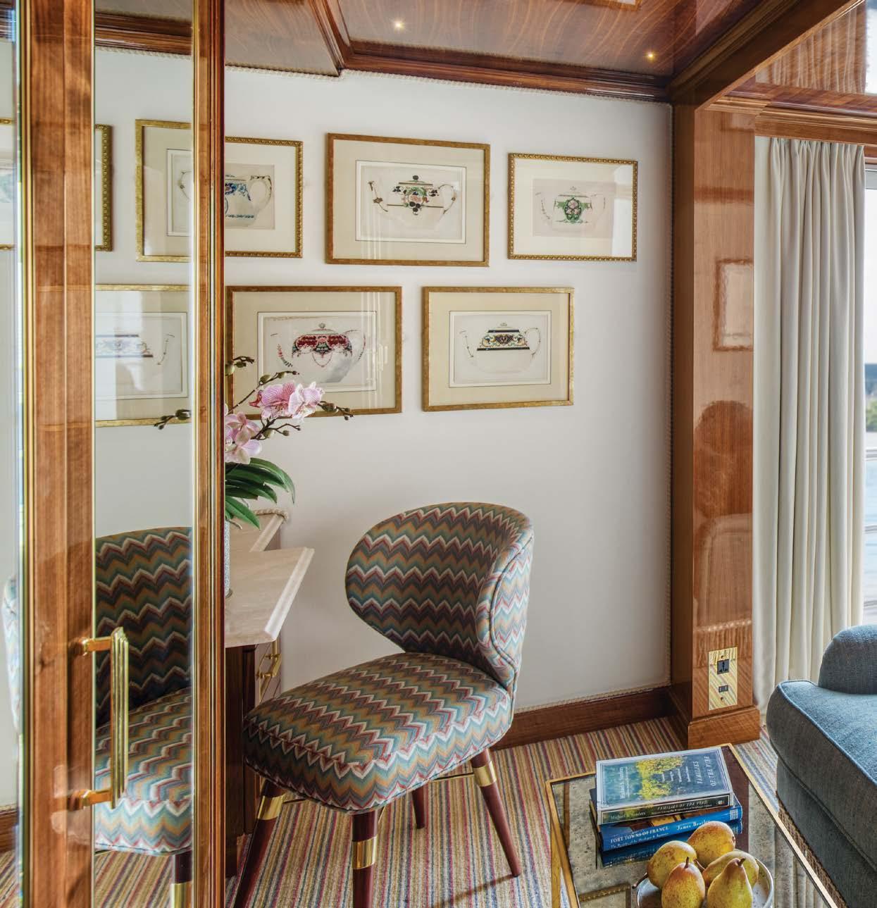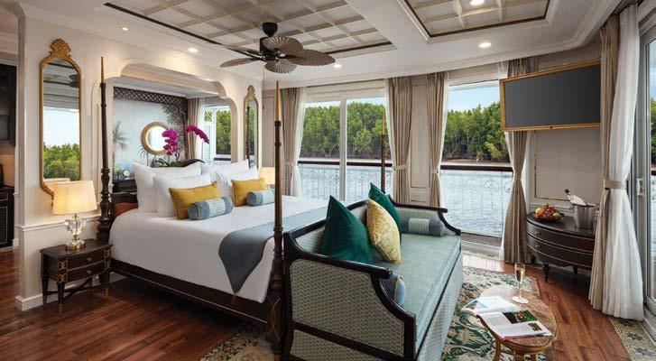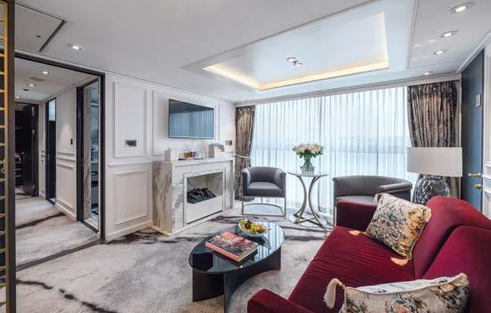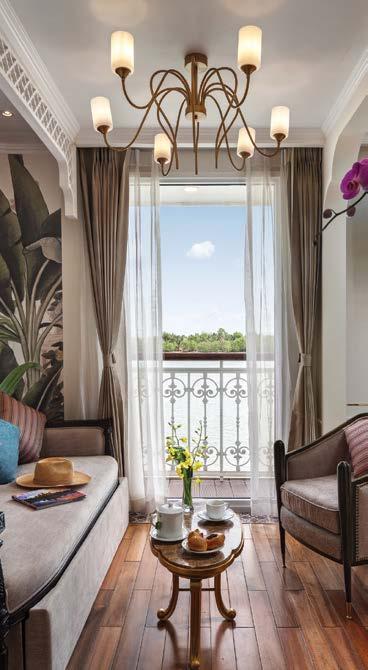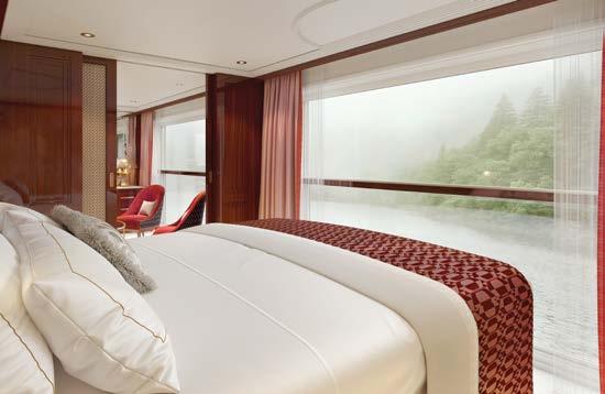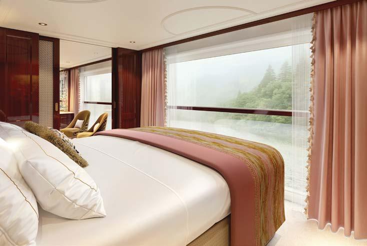 The ship’s spacious, high-ceilinged suites are a serene sanctuary, with beautiful hand-painted murals and all the comforts of a five-star hotel. All suites have a cosy sitting area and a French balcony with floor-to-ceiling glass doors. A bed dressed in soft linens, with a choice of pillows. Your roomy bathroom has a rain shower, comfy robes and slippers, and spa-quality bath products.