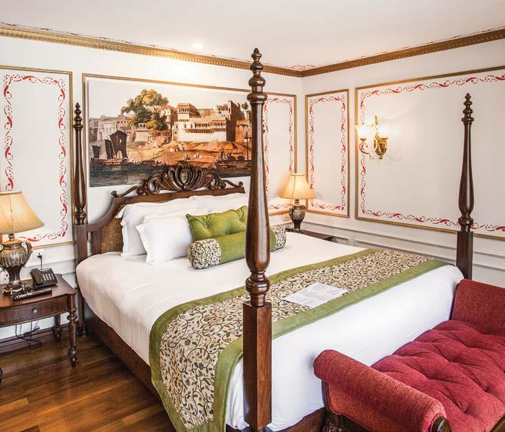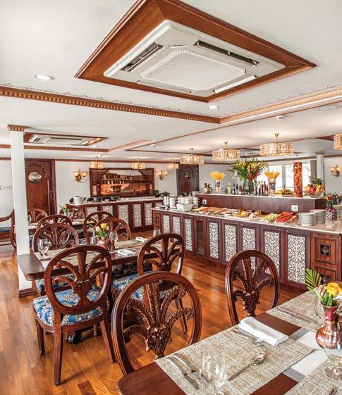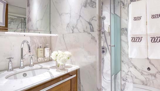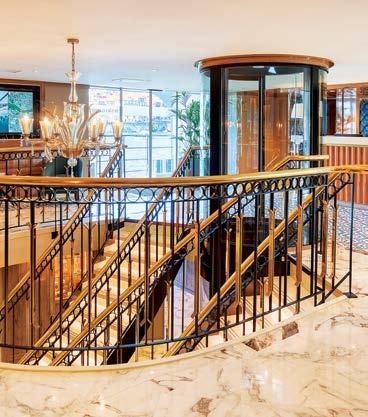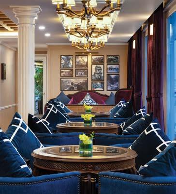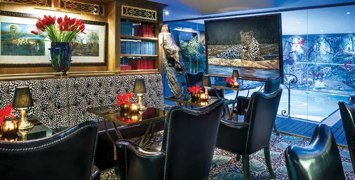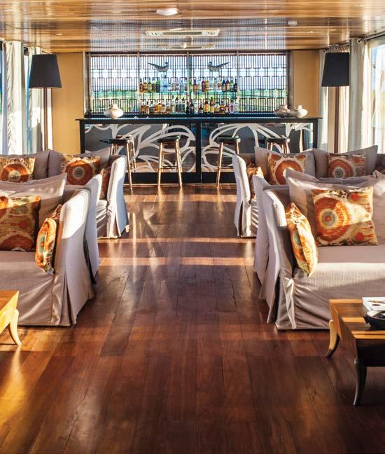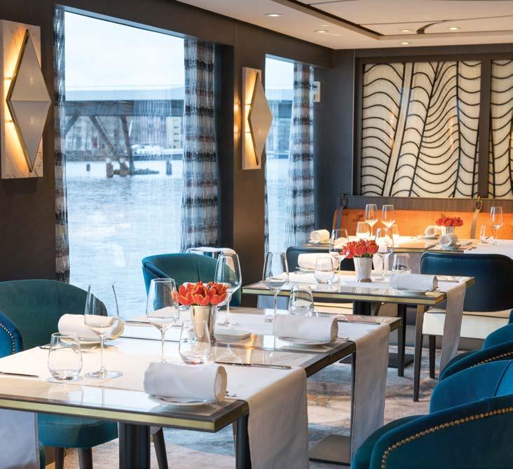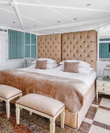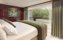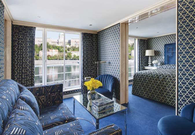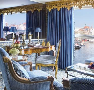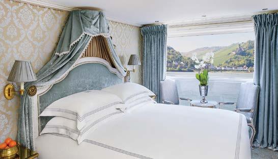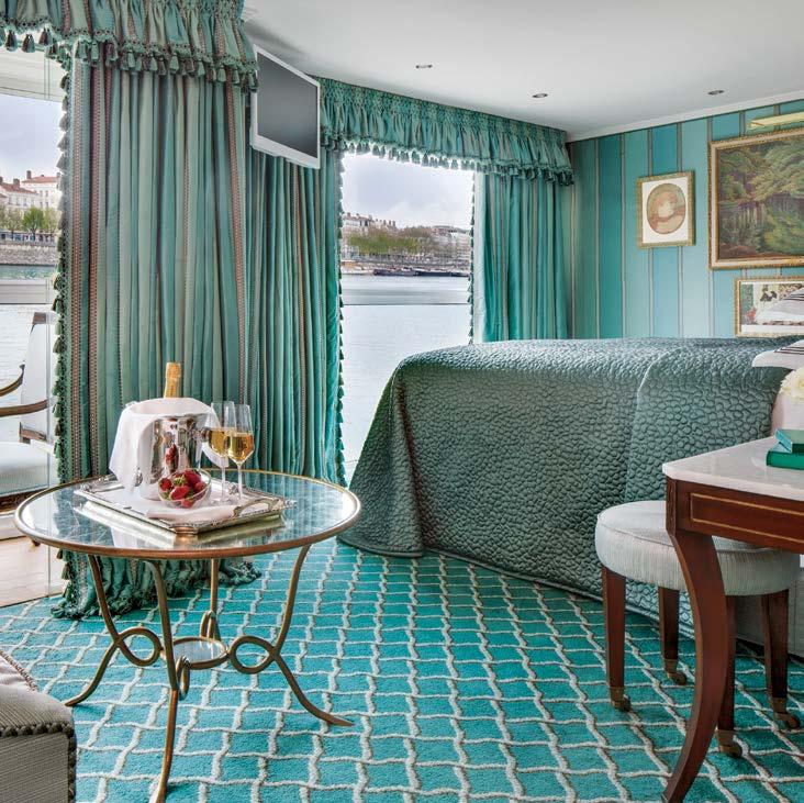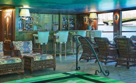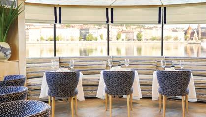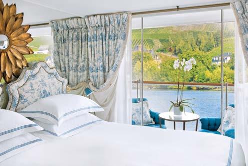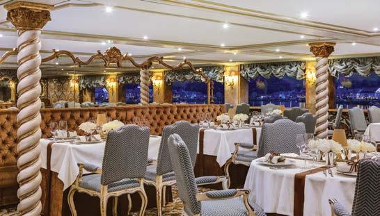 The luxurious décor of the 135-metre, 152-passenger S.S. Antoinette —Uniworld’s first Super Ship—features fine Brazilian marble on the walls and floors, a 19th-century Venetian glass mi rror, a stylish Bar du Leopard with full-service bar, and an onboard cinema. The two-story foyer boasts a 3 metre blue Strauss Baccarat chandelier with huge sapphires—a stunning piece that once hung in New York’s famous Tavern on the Green—and a collection of original artwork is displayed throughout the ship.