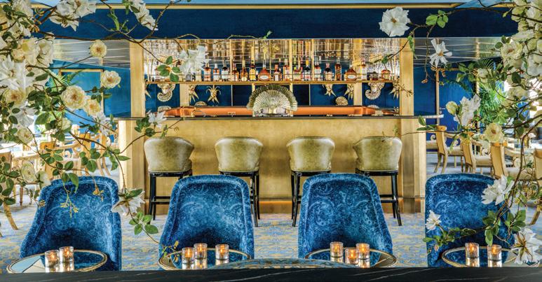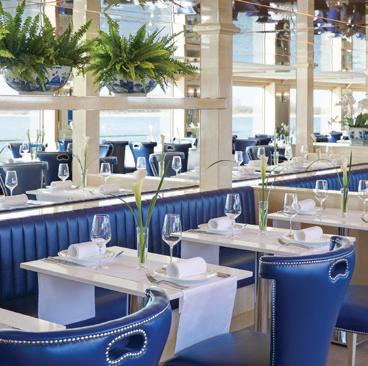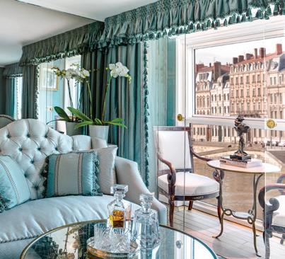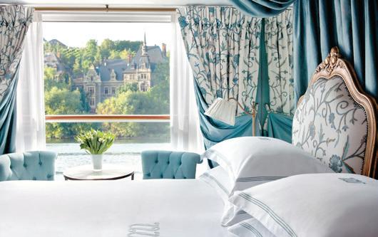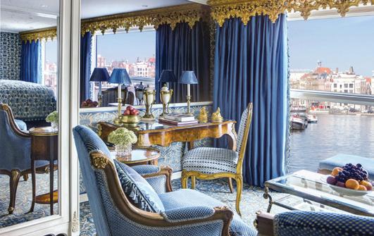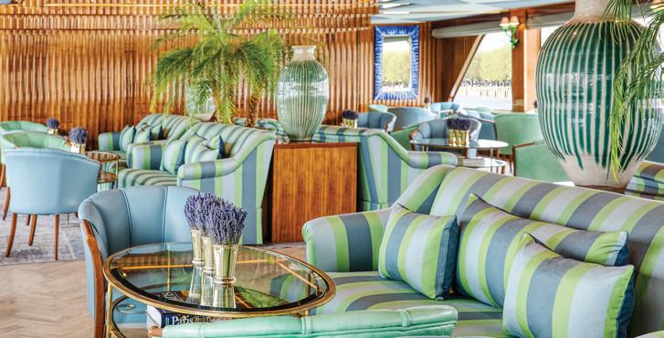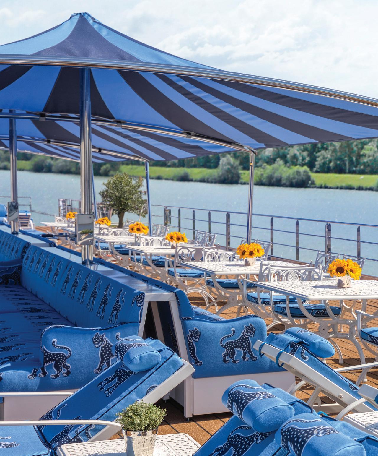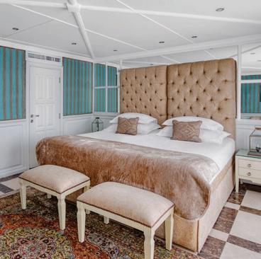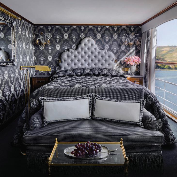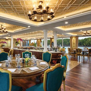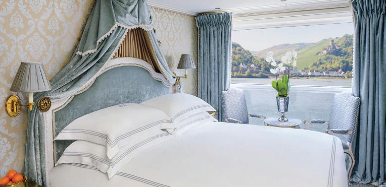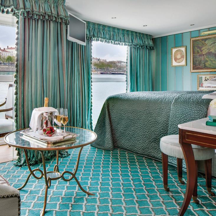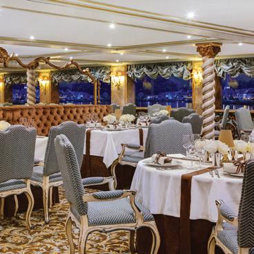 The luxurious décor of the 443-foot, 152-passenger S.S. Antoinette—Uniworld’s first Super Ship TM—features fine Brazilian marble on the walls and floors, a 19th-century Venetian glass mirror, a stylish Bar du Leopard with full-service bar, and an onboard cinema. The twostory foyer boasts a 10-foot blue Strauss Baccarat chandelier with huge sapphires—a stunning piece that once hung in New York’s famous Tavern on the Green—and a collection of original artwork is displayed throughout the ship.