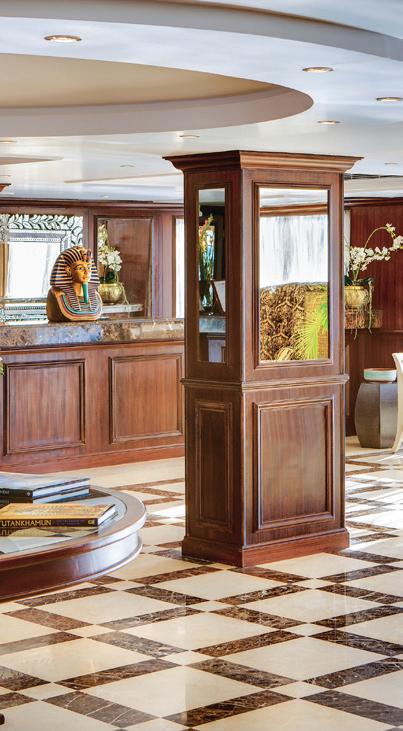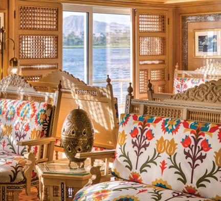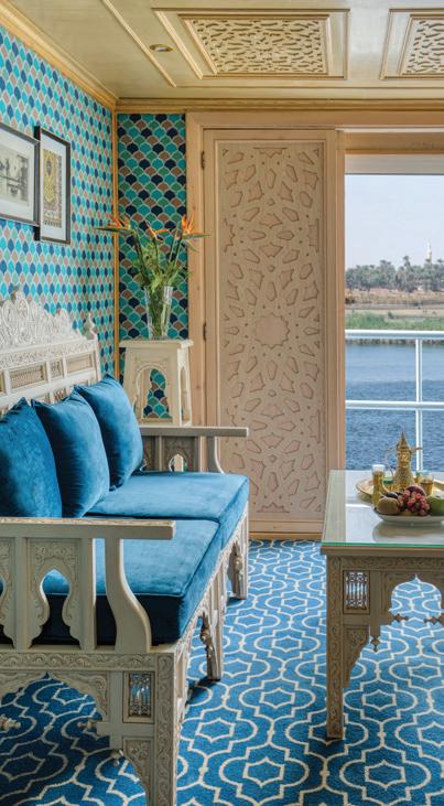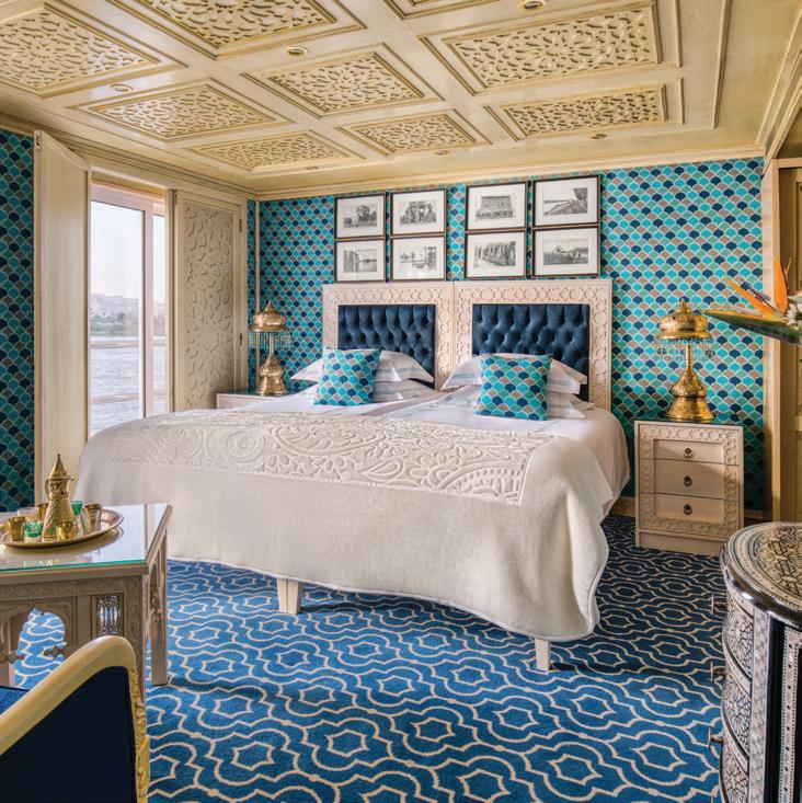 The S.S. Sphinx offers two gourmet dining venues, massage room, swimming pool, 26 gorgeously appointed suites, and 16 stunning French balcony staterooms, not to mention, sweeping views of the longest river in the world. This Super ShipTM offers an immersive onboard experience, with bespoke décor by local artisans and materials sourced regionally—such as fine Egyptian cottons, marble and hand-carved blonde wood—to highlight Egyptian craftsmanship while minimizing our carbon footprint.