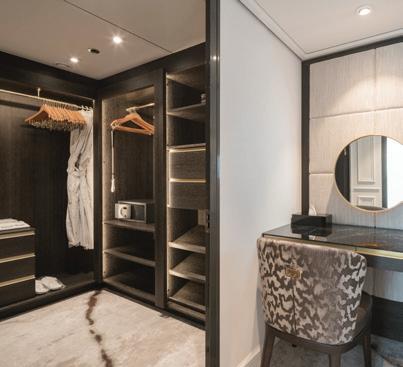 Other high-end amenities include a generous amount of closet space, under-bed storage, a flat-screen television with a wide selection of on-demand movies, individual climate control, bottled water replenished daily, fresh fruit and flowers upon arrival, makeup mirrors, and universal electrical plugs.