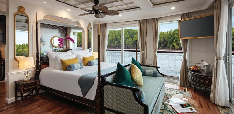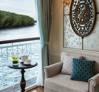 The ship’s spacious, high-ceilinged suites are a serene sanctuary, with beautiful hand-painted murals and all the comforts of a five-star hotel. All suites have a cozy sitting area and a French balcony with floor-to-ceiling glass doors. A bed dressed in soft linens, with a choice of pillows. Your roomy bathroom has a rain shower, comfy robes and slippers, and spa-quality bath products