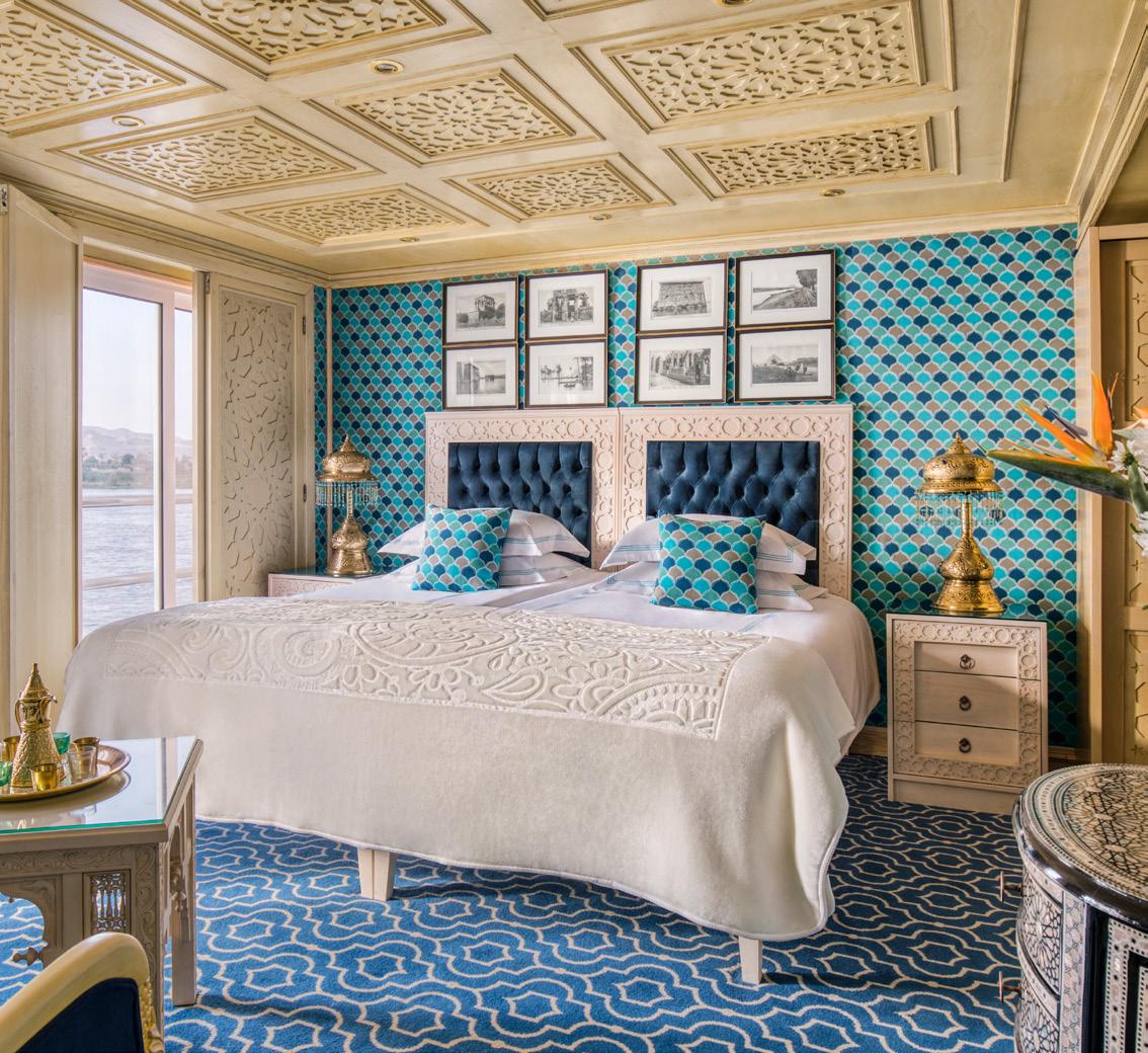 The S.S. Sphinx offers two gourmet dining venues, massage room, swimming pool, 26 gorgeously appointed suites and 16 stunning French balcony staterooms, not to mention, sweeping views of the longest river in the world. This Super Ship offers an immersive onboard experience, with bespoke décor by local artisans and materials sourced regionally -such as fine Egyptian cottons, marble and handcarved blonde wood-to highlight Egyptian craftsmanship while minimising our carbon footprint.