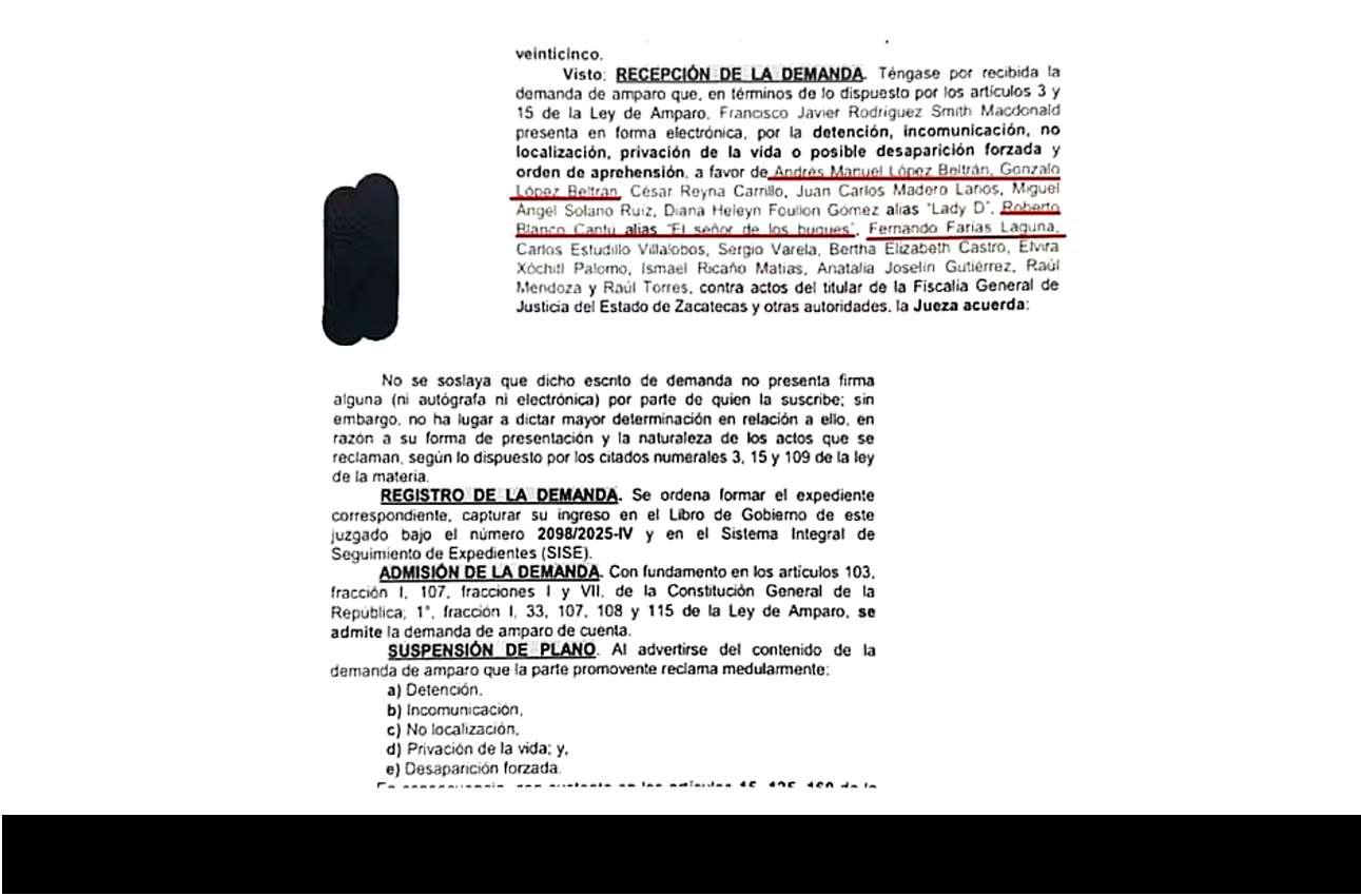 La primera resolución correspondió a la jueza Claudia Cecilia Dueñas Cruz, del Juzgado Segundo de Distrito con sede en Zacatecas; fue difundida por el periodista Claudio Ochoa Huerta a través de su cuenta en la red social X,donde precisó que el amparofuepromovidoporunapersonaidentificada como Francisco Javier Rodríguez Smith Macdonald.