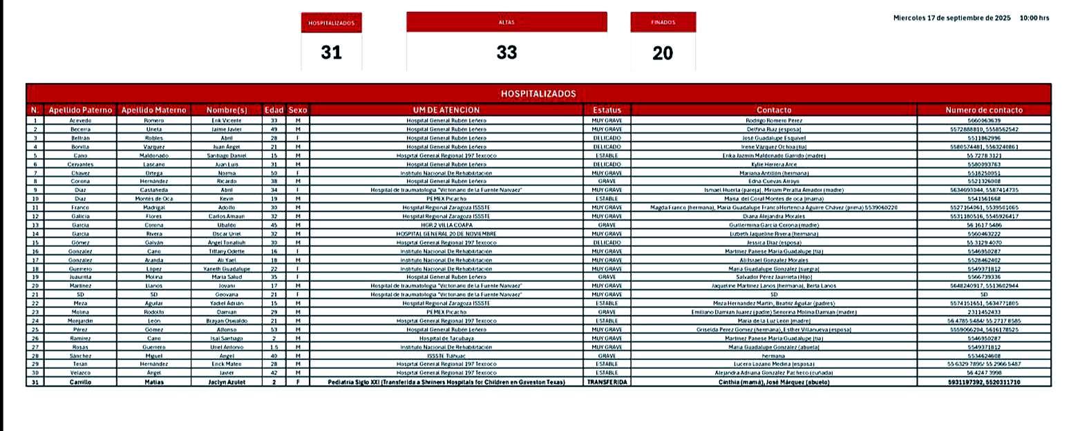 Entre las muertes reportadas se encuentra la del chofer de la pipa accidentada, Fernando Soto Munguía,de 34 años,quien permanecía internado bajo custodia en el Hospital de Traumatología Victoriano de la Fuente Narváez. La dependencia precisó que, además de los fallecidos, 32 personas continúan hospitalizadas por la gravedad de sus lesiones, mientras que 33 pacientes han sido dados de alta en distintos centros de salud.