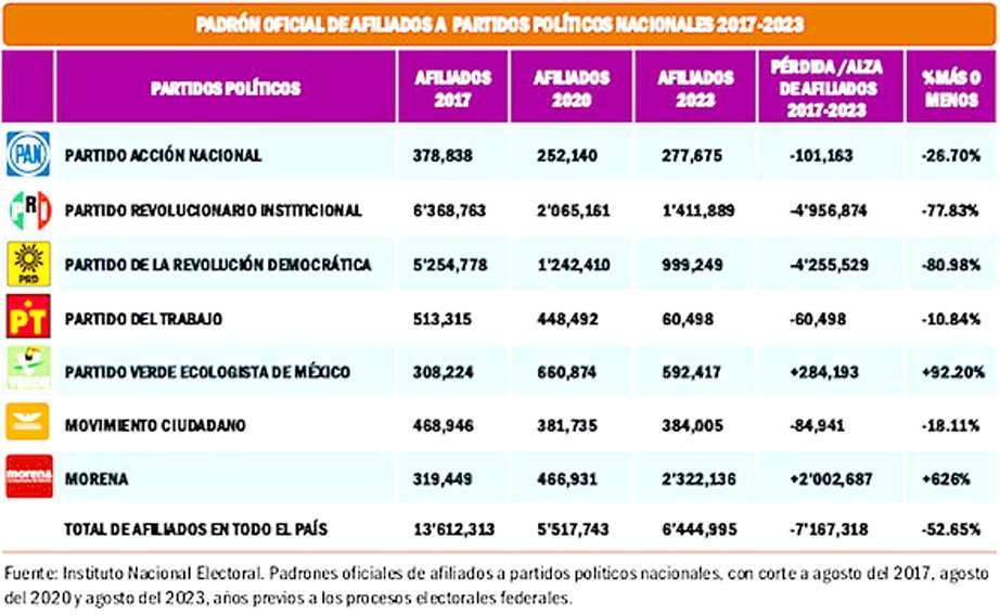 Son tan pobres los números de los partidos políticos, que entre la verificación de agosto de 2017 y la de agosto de 2023, en conjunto, perdieron más de 6 millones de afiliados, de los 13 millones que tenían hace ocho años.