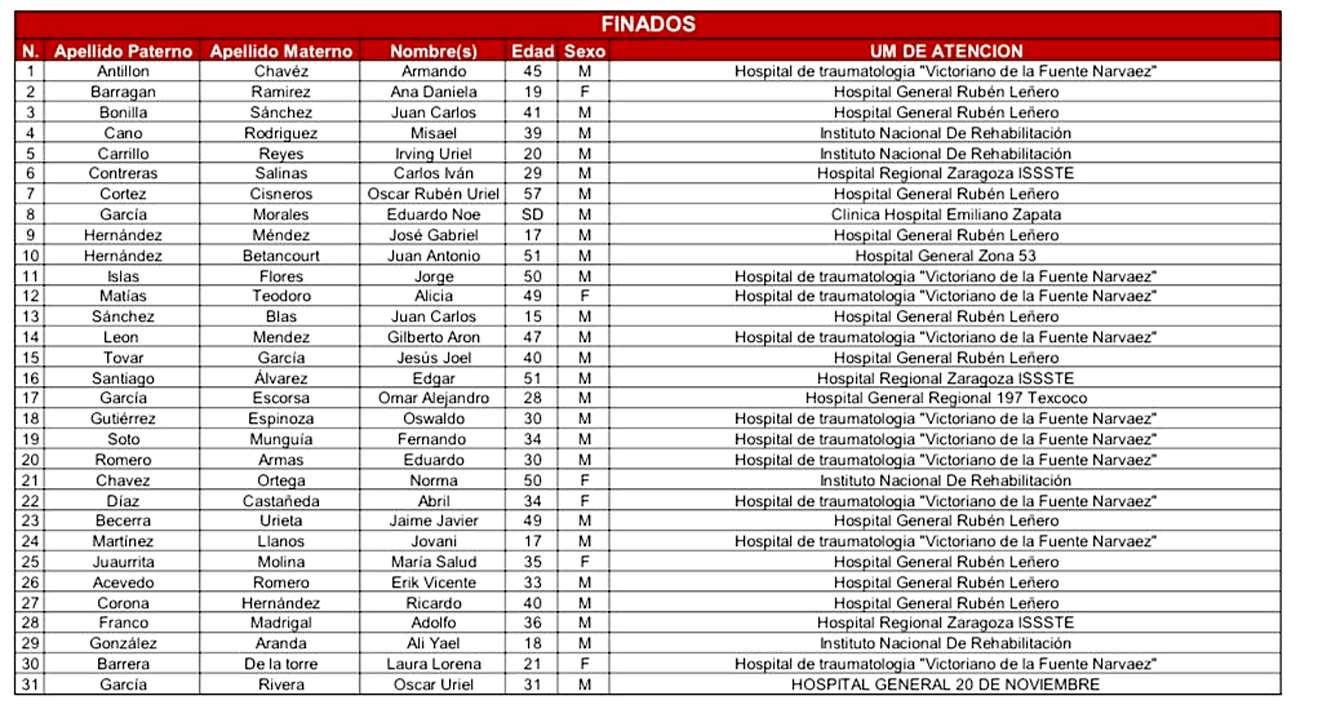 En su último corte,la dependencia detalló que además de las 31 defunciones,13 personas continúan hospitalizadas, varias de ellasenestadodelicado,y40hansidodadas de alta, luego de recibir tratamiento en distintas unidades médicas, incluyendo hospitales de alta especialidad del ISSSTE,IMSS,Pemex y la Secretaría de Salud capitalina.