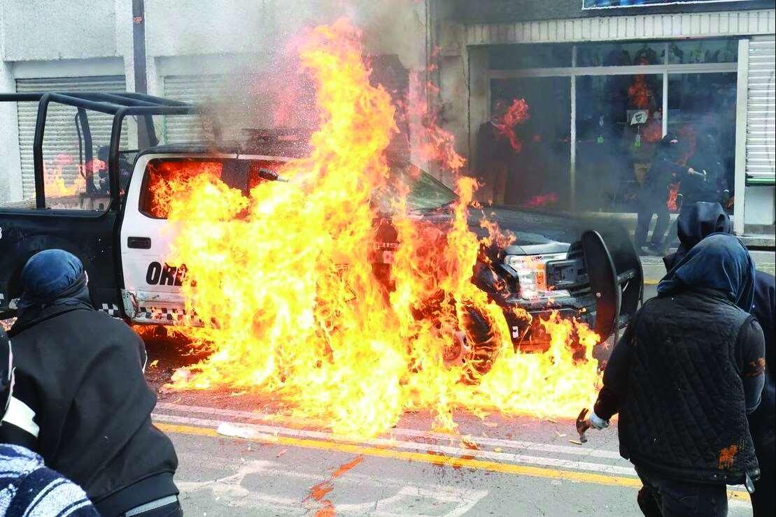 grupodelautodenominadoEnjambre EstudiantilUnificadoprendiófuegoauna patrulladeOrdenVialdelaPolicíaMunicipal. ElataqueocurrióenlaesquinadeGómezFarías eIgnacioLópezRayón,justofrentealedificiode
