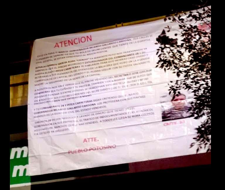 grupo del crimen organizado. "Ricardo Gallardo Cardona, tus calles se llenarán de sangre,ya que tu bola de delincuentes que tienes en la guardia civil estatal se está vendiendo al mejor postor", escribieron en la "narcomanta".