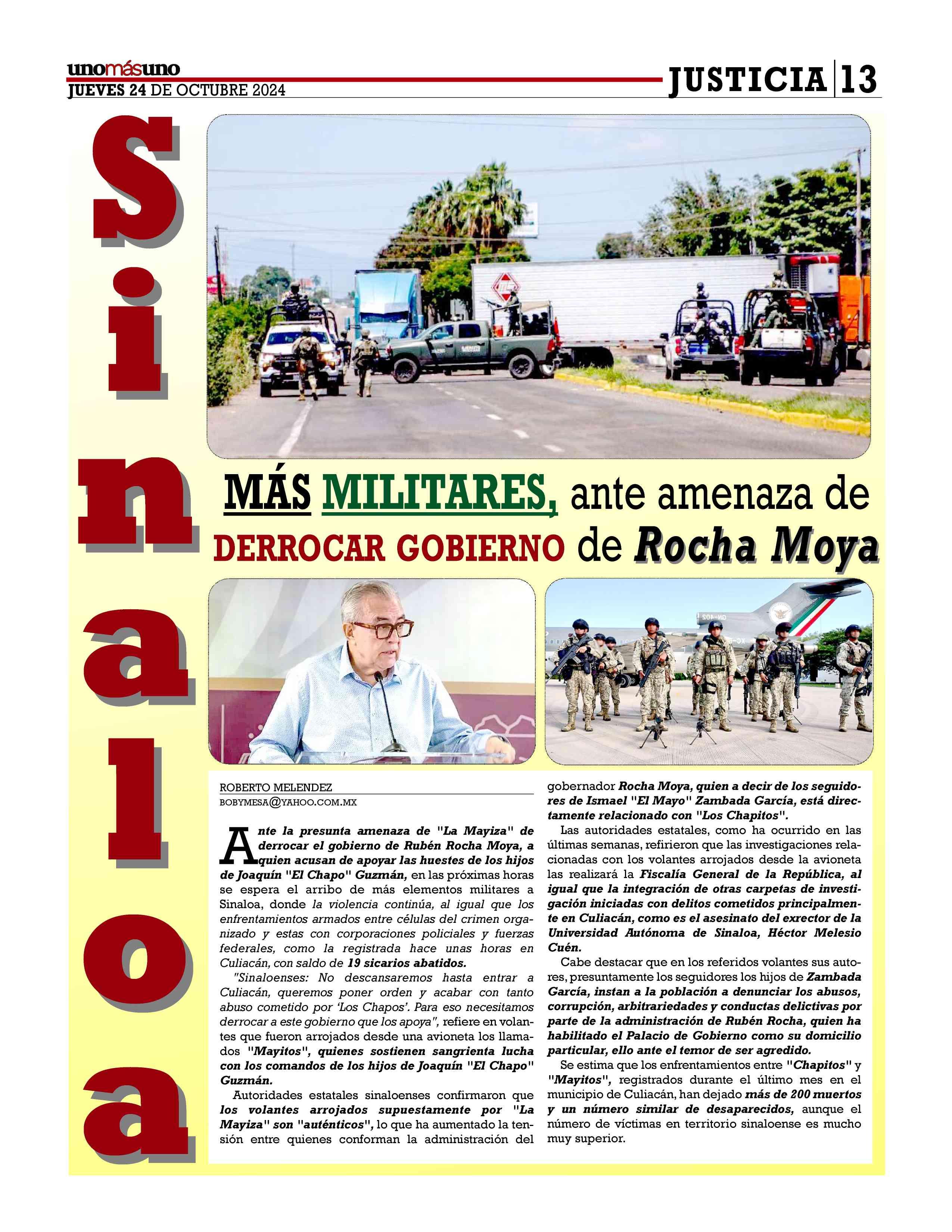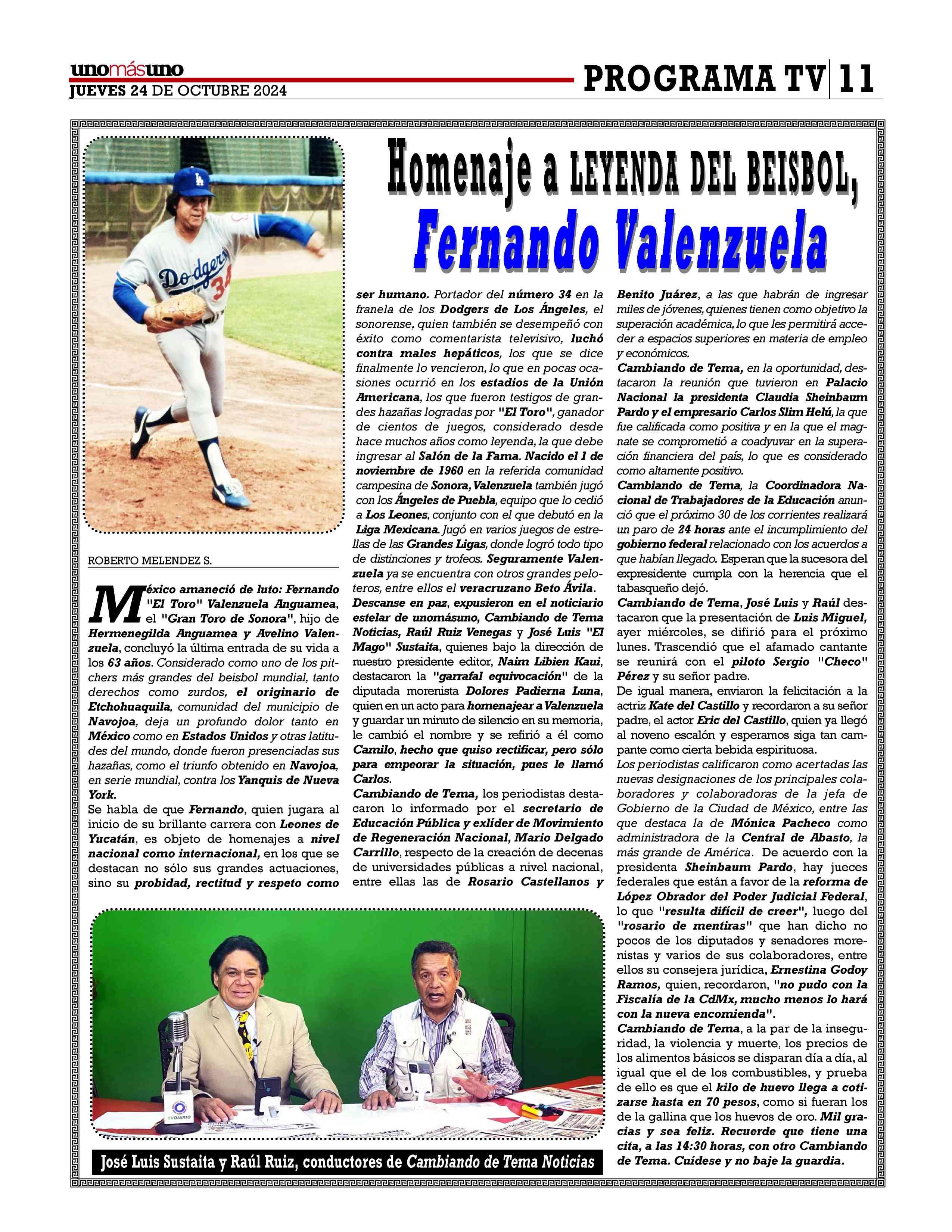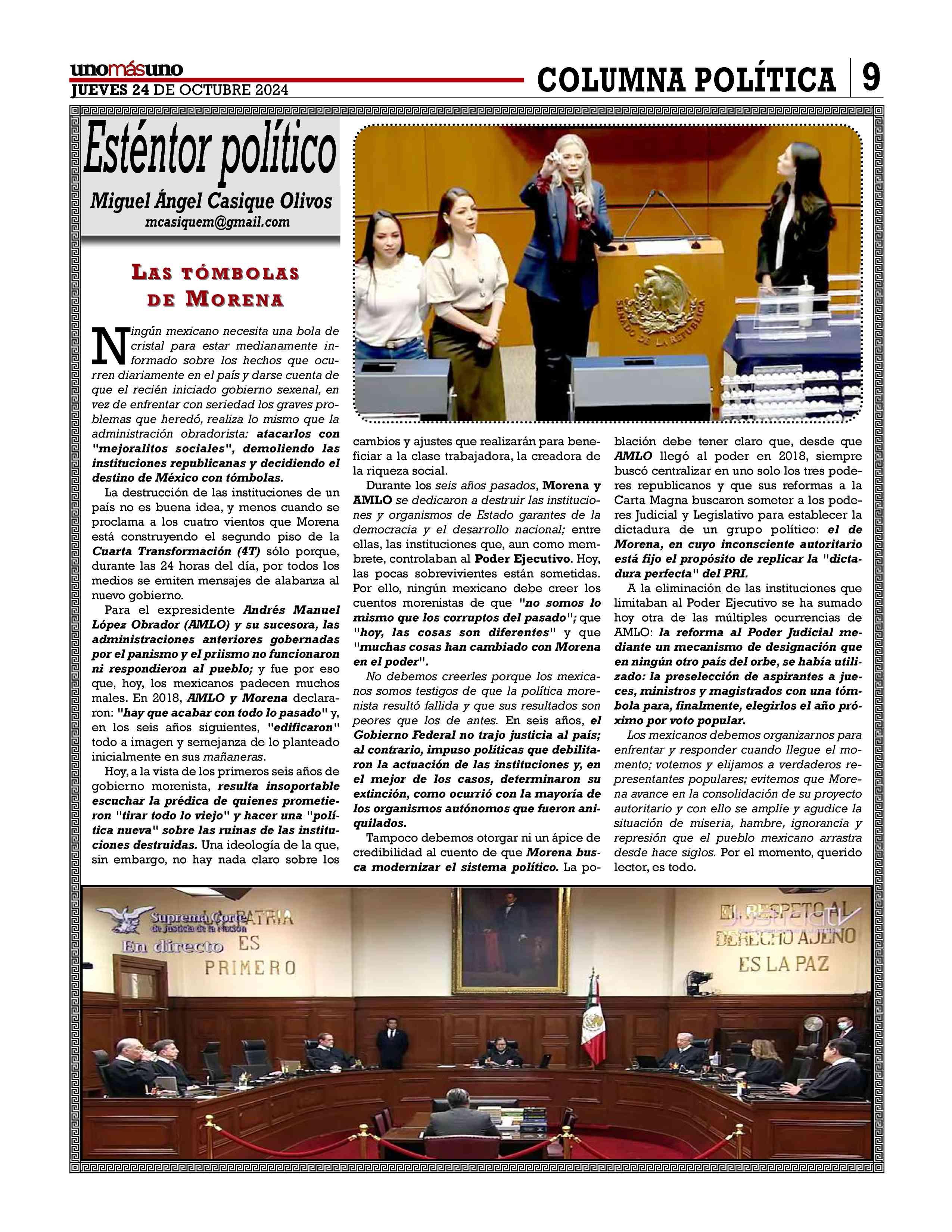 AñoXLVII-Número16326Jueves24deoctubre2024 UNOMÁSUNONACIONAL.EditorResponsable:NAIM LIBIENKAUI.Publicacióndiaria,editadaydistribuidaporLIBIEN &SON’SSAdeCVentalleresdeGabinoBarreda86bis.Col.San Rafael,CiudaddeMéxico,C.P.06470,DelegaciónCuauhtémoc TeléfonoCDMX:55/10555500.Ext.Redacción102-103y105, PlantaToluca017221340000Ext.116. Losartículosynotaspublicadosenesta edición,sonresponsabilidaddequienlosfirma.