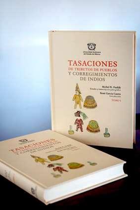 TOLUCA,México.- Como parte de las actividades de abril, mes de la lectura, la Universidad Autónoma del Estado de México (UAEMéx), presentó el libro Tasaciones de tributos de pueblos y corregimientos de indios,tomos I y II, producto de la investigación del doctor en Letras Michel R.Oudijk y del doctor en Historia por esta casa de estudios, Leopoldo René García Castro, sobre tributos indígenas en el siglo XVI.