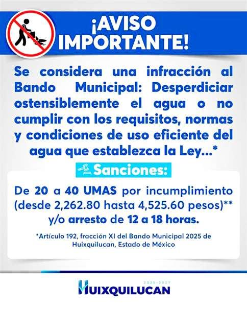 Cabe mencionar que el Artículo 192, fracción XI del Bando Municipal 2025 de Huixquilucan, establece sancionesporeldesperdiciode agua,las cuales vande20a 40UMAs(UnidadesdeMedidayActualización),esdecir, de 2 mil 262.80 hasta 4 mil 525.60 pesos y/o arresto de 12 a 18 horas, que podrá ser conmutable por seis a 12 horas de trabajo en favor de la comunidad.