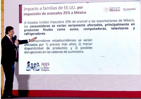 En su participación desde Palacio Nacional, Ebrard indicó que México es uno de los principales proveedores de automóviles (1), autopartes, computadoras (5), pantallas (2) y refrigeradores (3) en Estados Unidos.La aplicación de aranceles afectaría a 12 millones de familias estadounidenses que consuman automóviles de México. "Estos consumidores pagarían un monto adicional de 10 mil 427 millones de dólares, causando fuertes presiones inflacionarias".