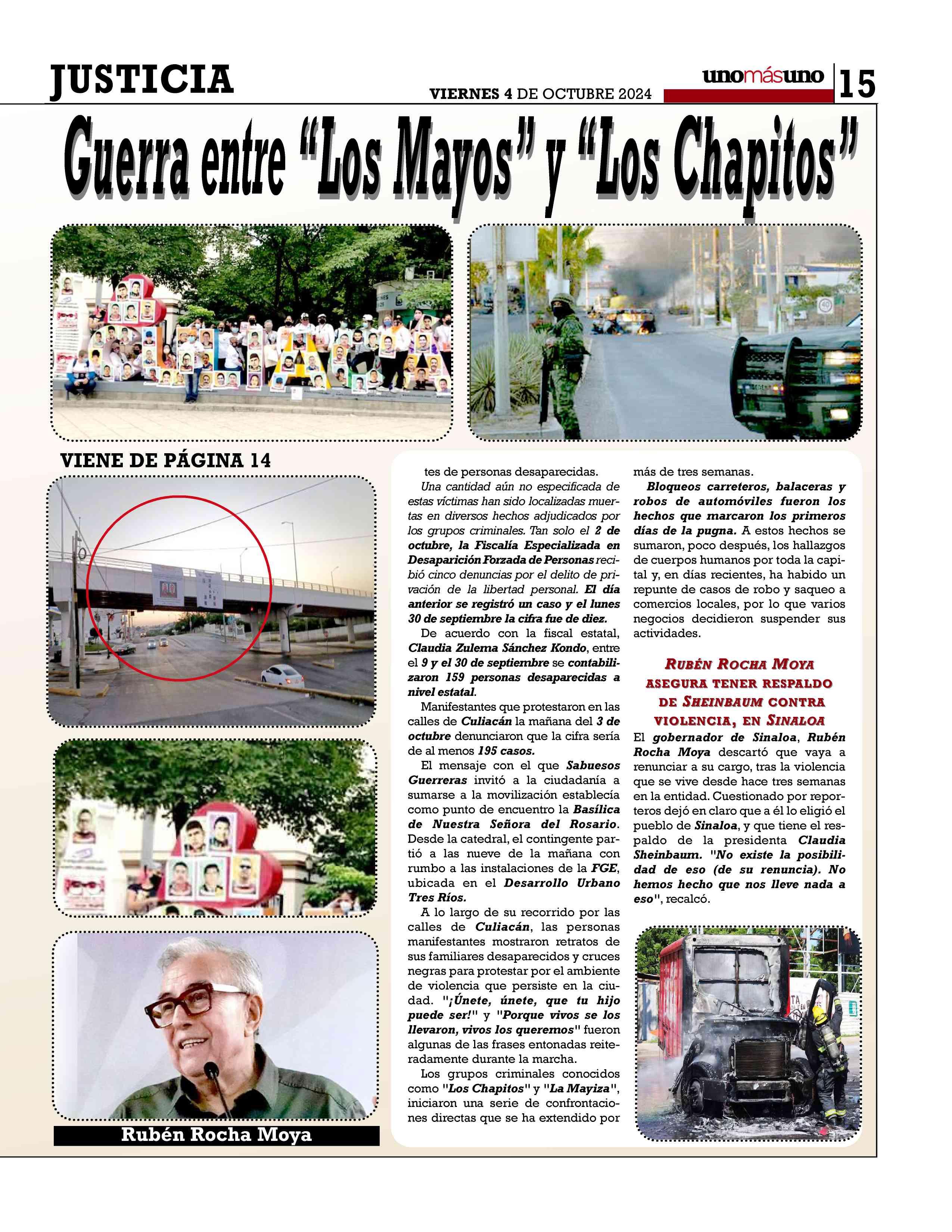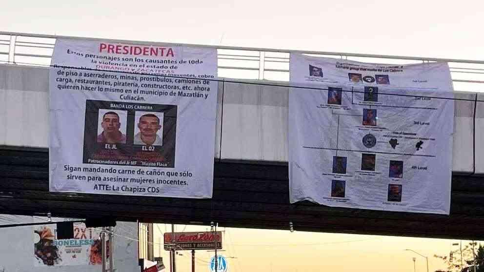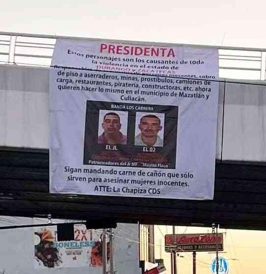 urante la mañana del 3 de octubre,habitantesdelaciudad de Culiacán, Sinaloa, reportaron la presencia de diversas narcomantas, presuntamente firmadaspor"LaChapiza",queibandirigidas a la presidenta de México, Dra. Claudia Sheinbaum Pardo Según los informes preliminares, estos mensajes fueron colocados en almenostrespuntosdiferentesdela capital sinaloense: el puente de las avenidas Álvaro Obregón yMéxico 68,el puente en Álvaro Obregón y MalecónNuevo,yelPuenteNegro Eneltexto,supuestamenteatribuido a "La Chapiza" o "Los Chapitos",del CárteldeSinaloa, los autores acusan como causantesde la violencia en el estado al grupo criminal contrario, el cual está bajo el mando de Ismael Zambada Sicairos,alias "Mayito Flaco", hijo de Ismael "El Mayo" Zambada.