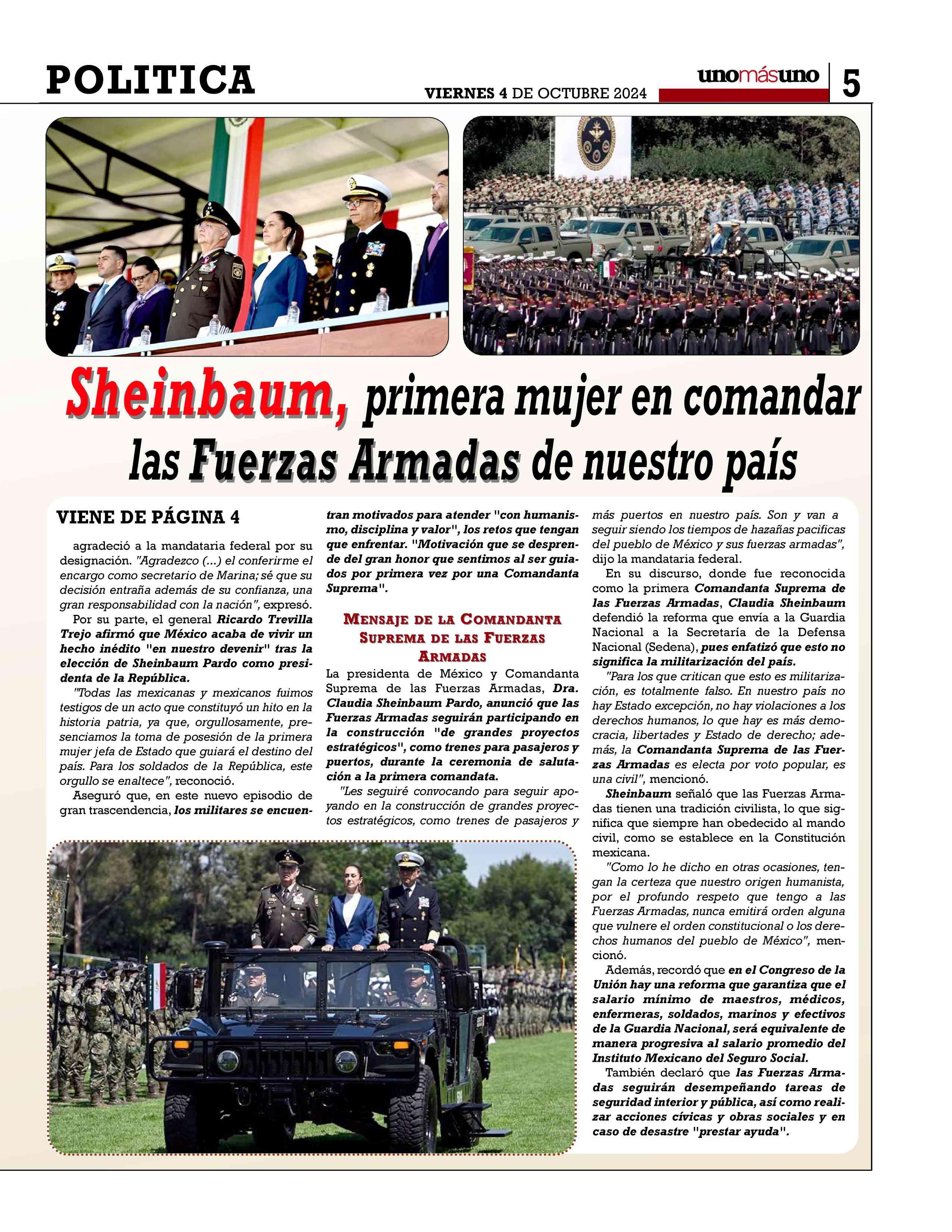 Por primera vez una mujer encabezó la ceremonia de salutación de las Fuerzas Armadas y la Guardia Nacional, la cual es una tradición donde marinos, soldados, pilotos reconocieron a la titular del Poder Ejecutivo, Claudia Sheinbaum, como su comandata suprema.