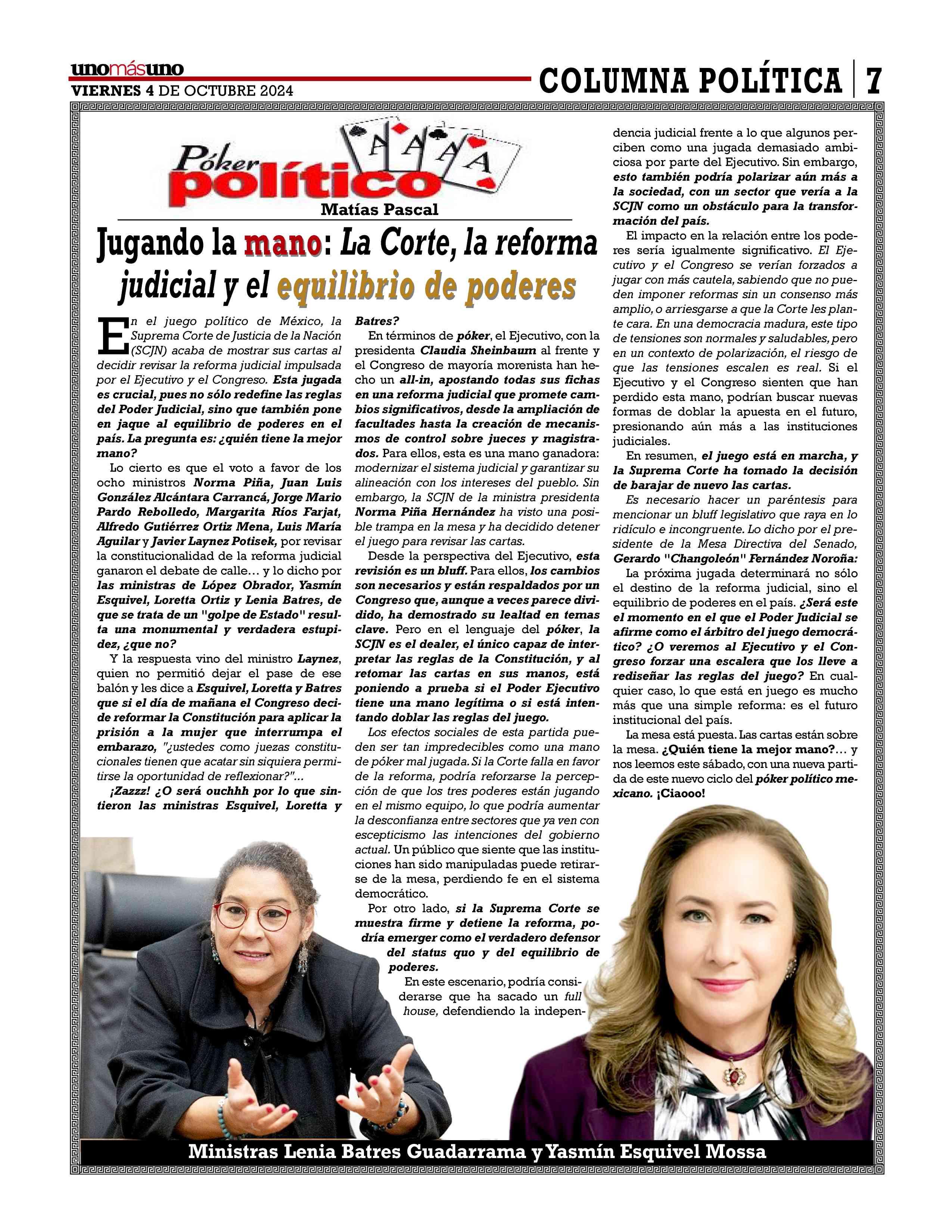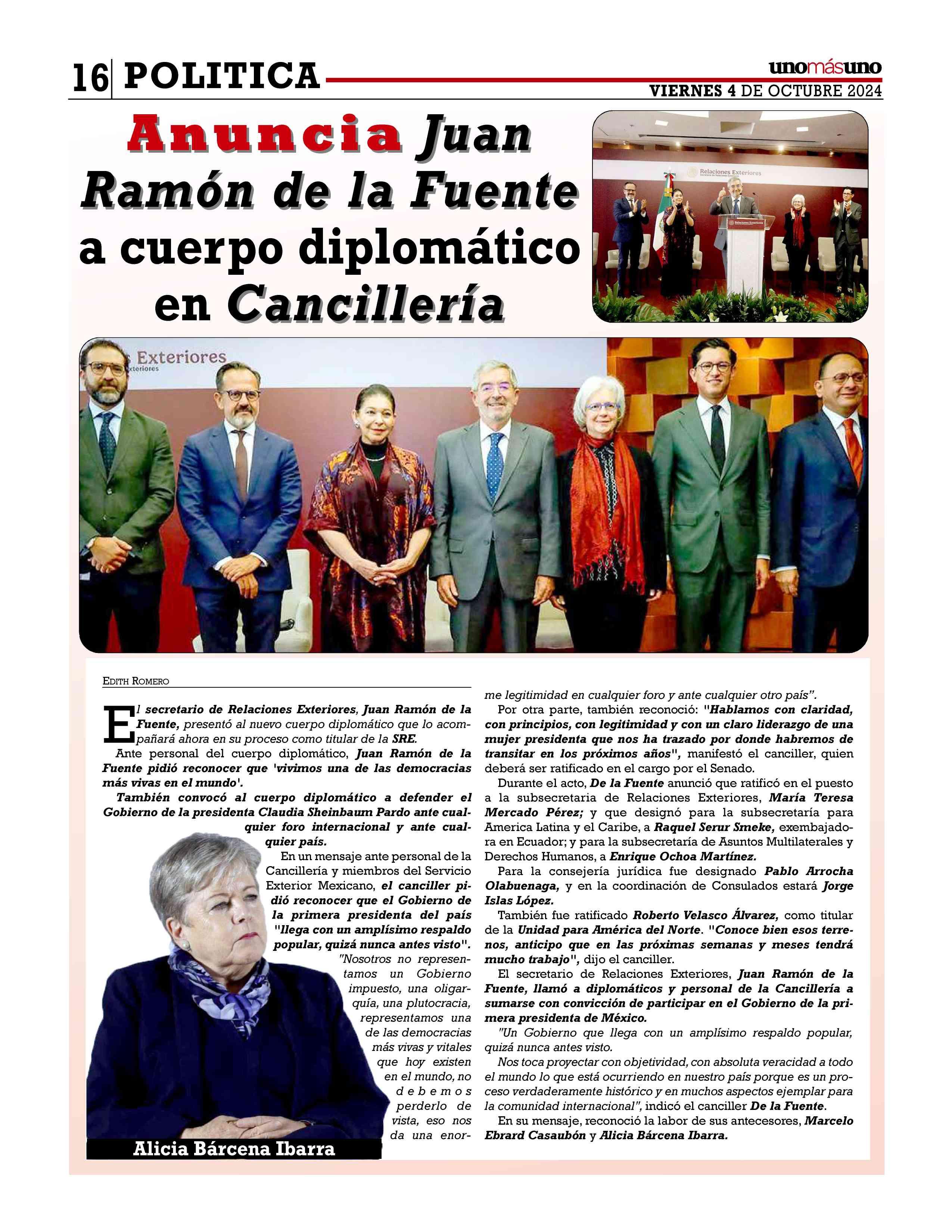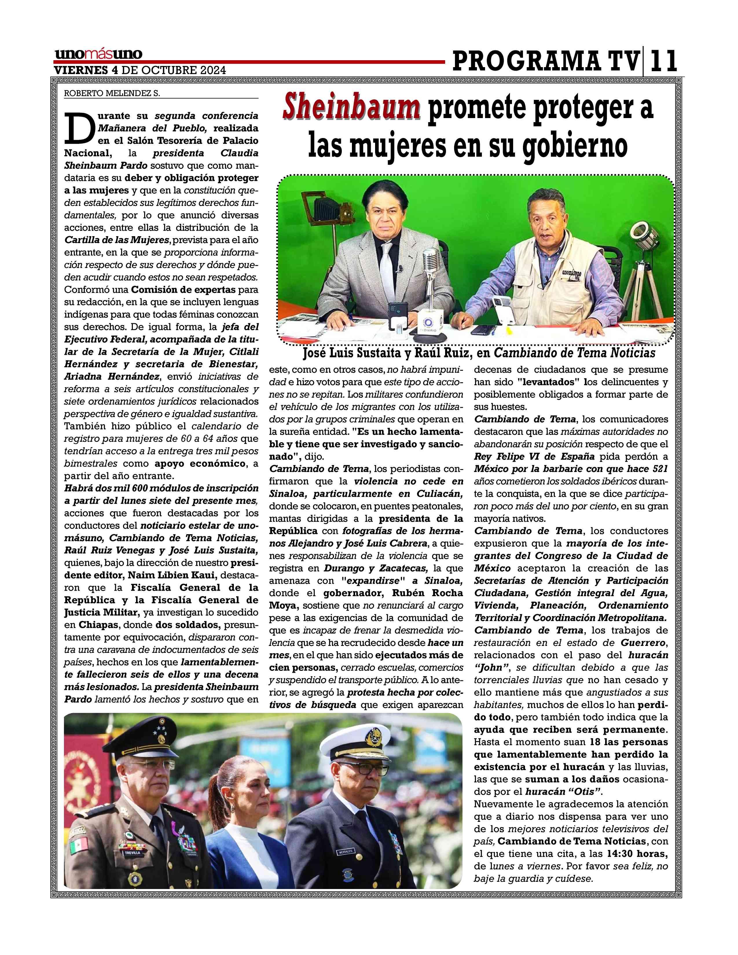 AñoXLV-Número16307Viernes4deoctubre2024 UNOMÁSUNONACIONAL.EditorResponsable:NAIM LIBIENKAUI.Publicacióndiaria,editadaydistribuidaporLIBIEN &SON’SSAdeCVentalleresdeGabinoBarreda86bis.Col.San Rafael,CiudaddeMéxico,C.P.06470,DelegaciónCuauhtémoc TeléfonoCDMX:55/10555500.Ext.Redacción102-103y105, PlantaToluca017221340000Ext.116. Losartículosynotaspublicadosenesta edición,sonresponsabilidaddequienlosfirma.