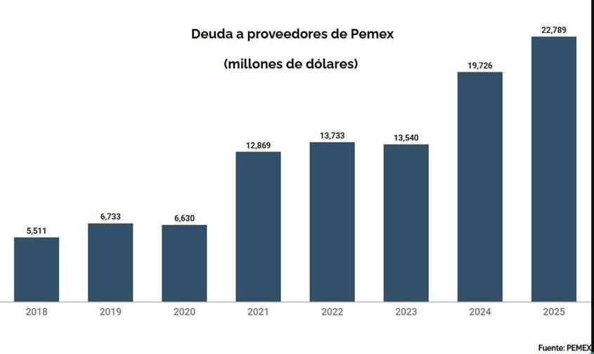En su comparación anual,la deuda de Pemex con proveedores fue 18.8 por ciento superior a la observada durante el segundo trimestre de 2024, por lo que la petrolera estatal no ha podido ponerse al corriente con sus adeudos.