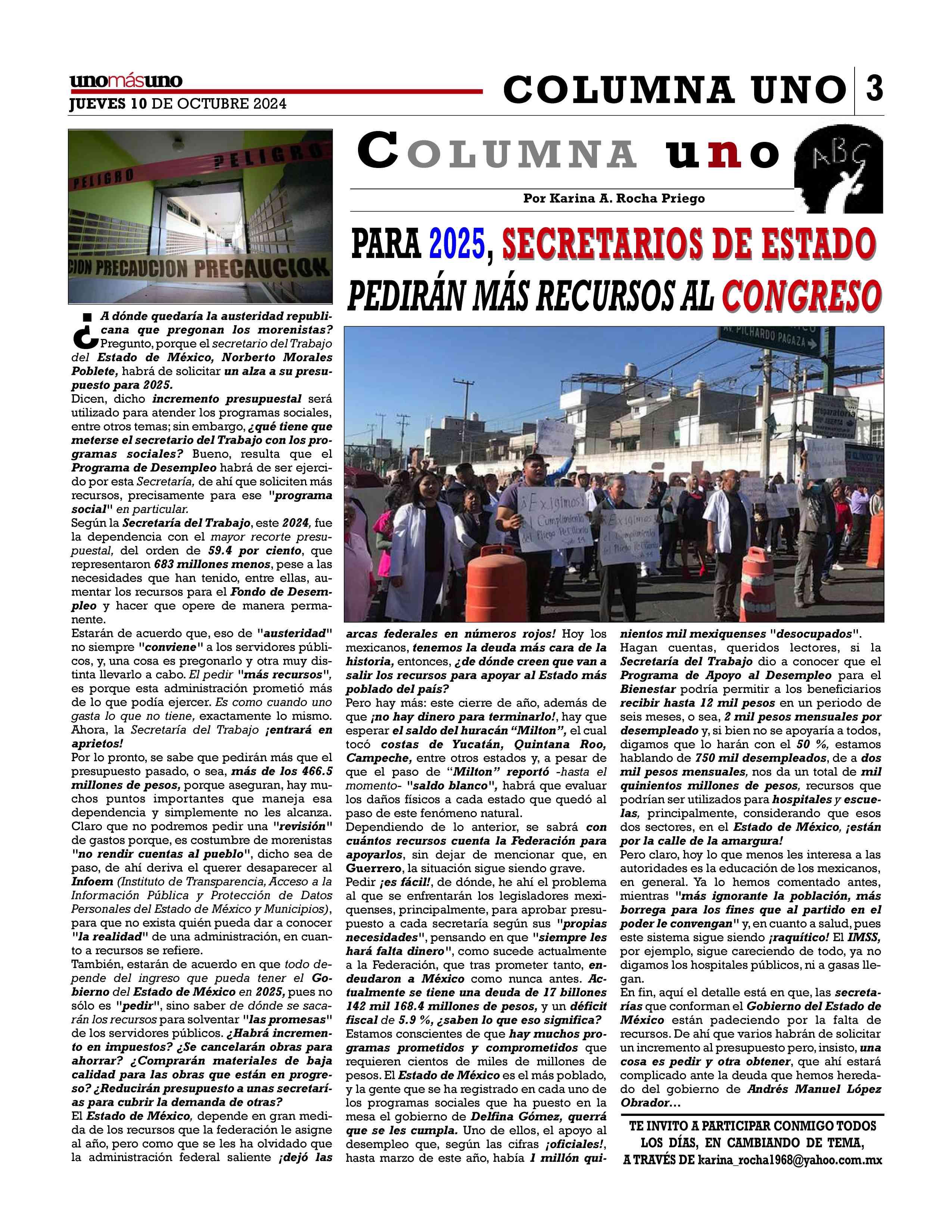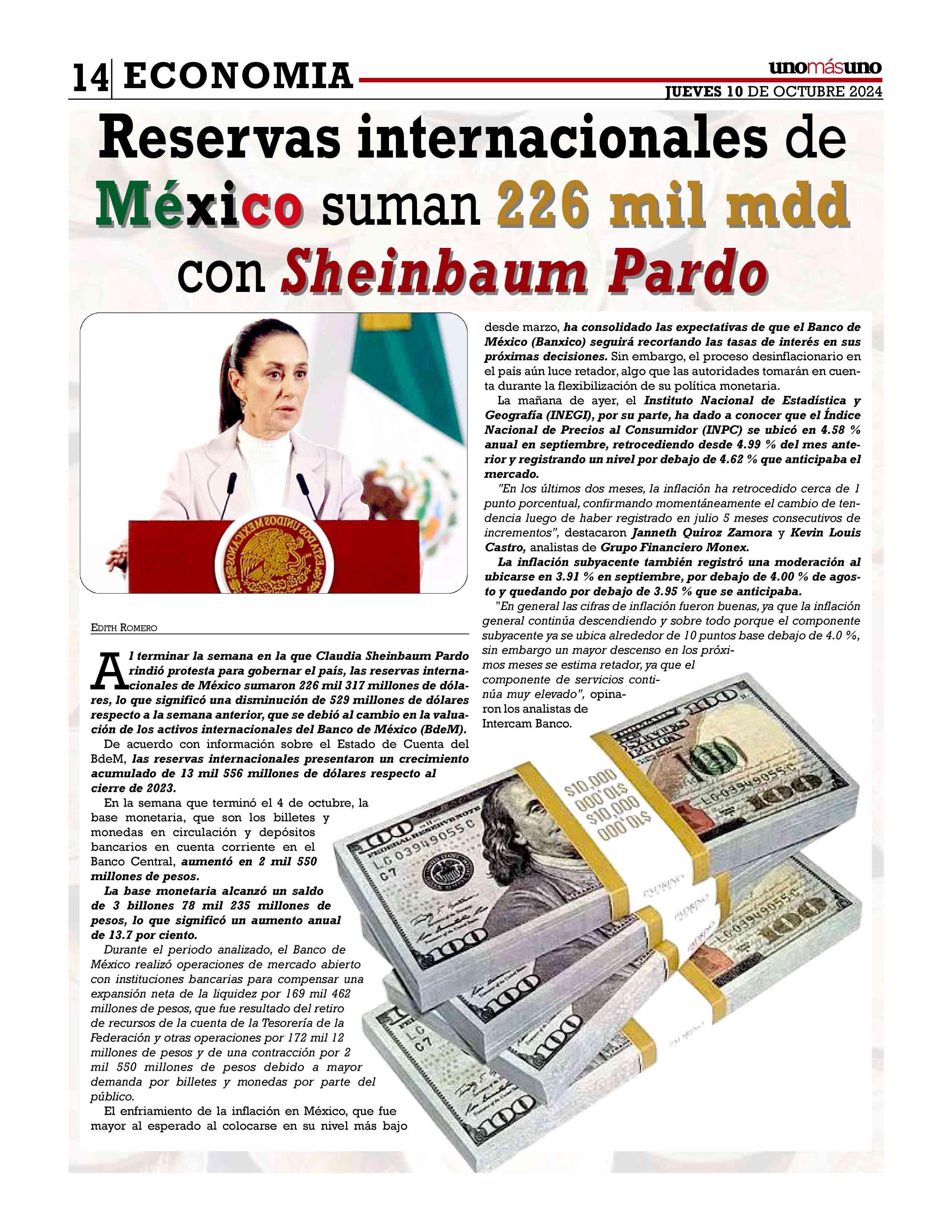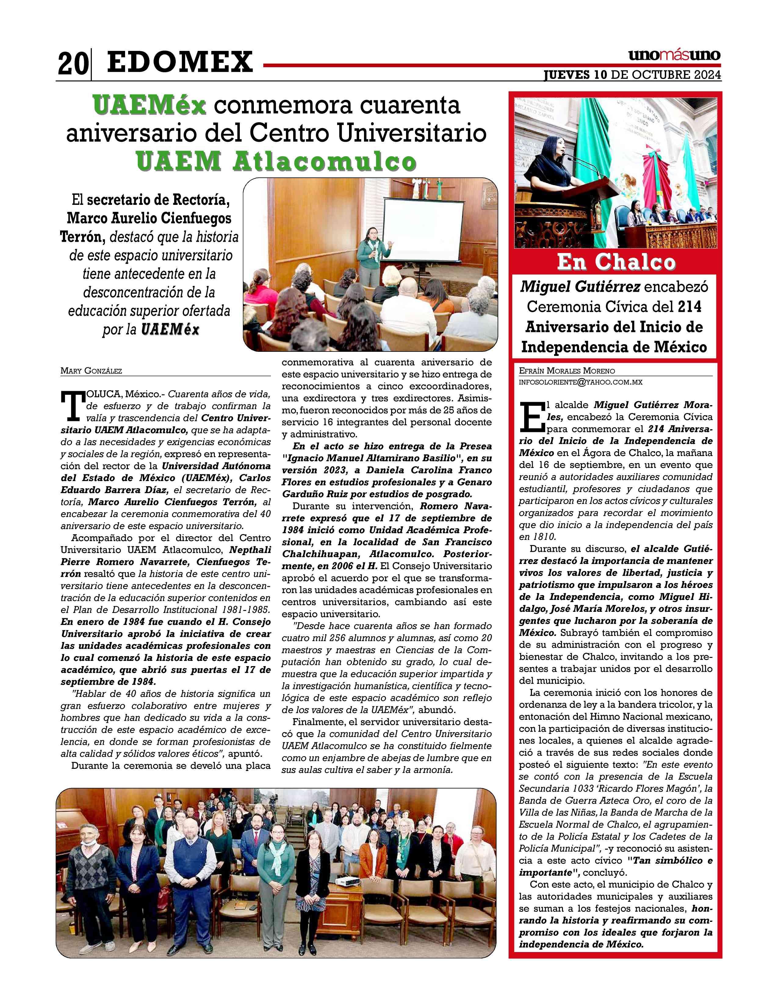 AñoXLV-Número16313Jueves10deoctubre2024 UNOMÁSUNONACIONAL.EditorResponsable:NAIM LIBIENKAUI.Publicacióndiaria,editadaydistribuidaporLIBIEN &SON’SSAdeCVentalleresdeGabinoBarreda86bis.Col.San Rafael,CiudaddeMéxico,C.P.06470,DelegaciónCuauhtémoc TeléfonoCDMX:55/10555500.Ext.Redacción102-103y105, PlantaToluca017221340000Ext.116. Losartículosynotaspublicadosenesta edición,sonresponsabilidaddequienlosfirma.