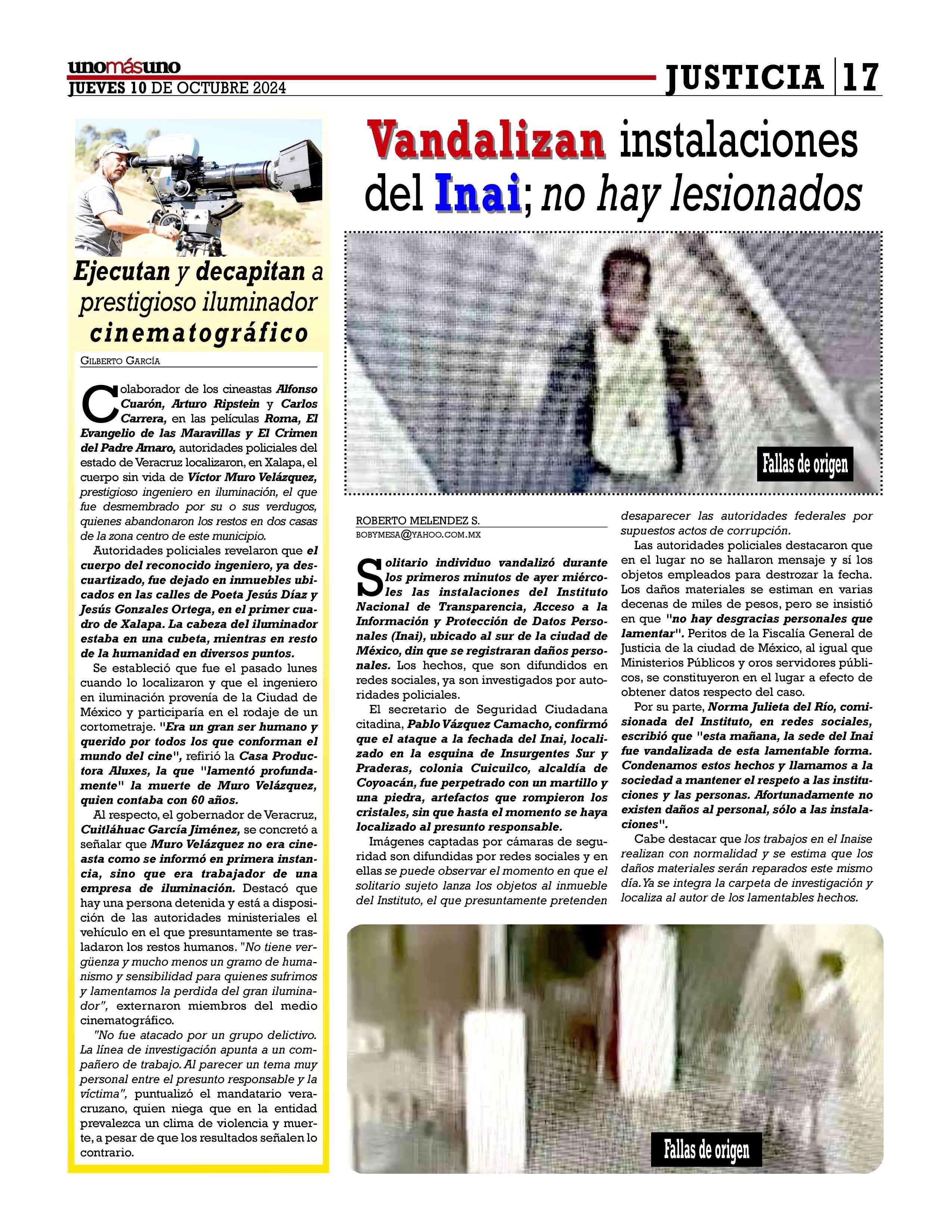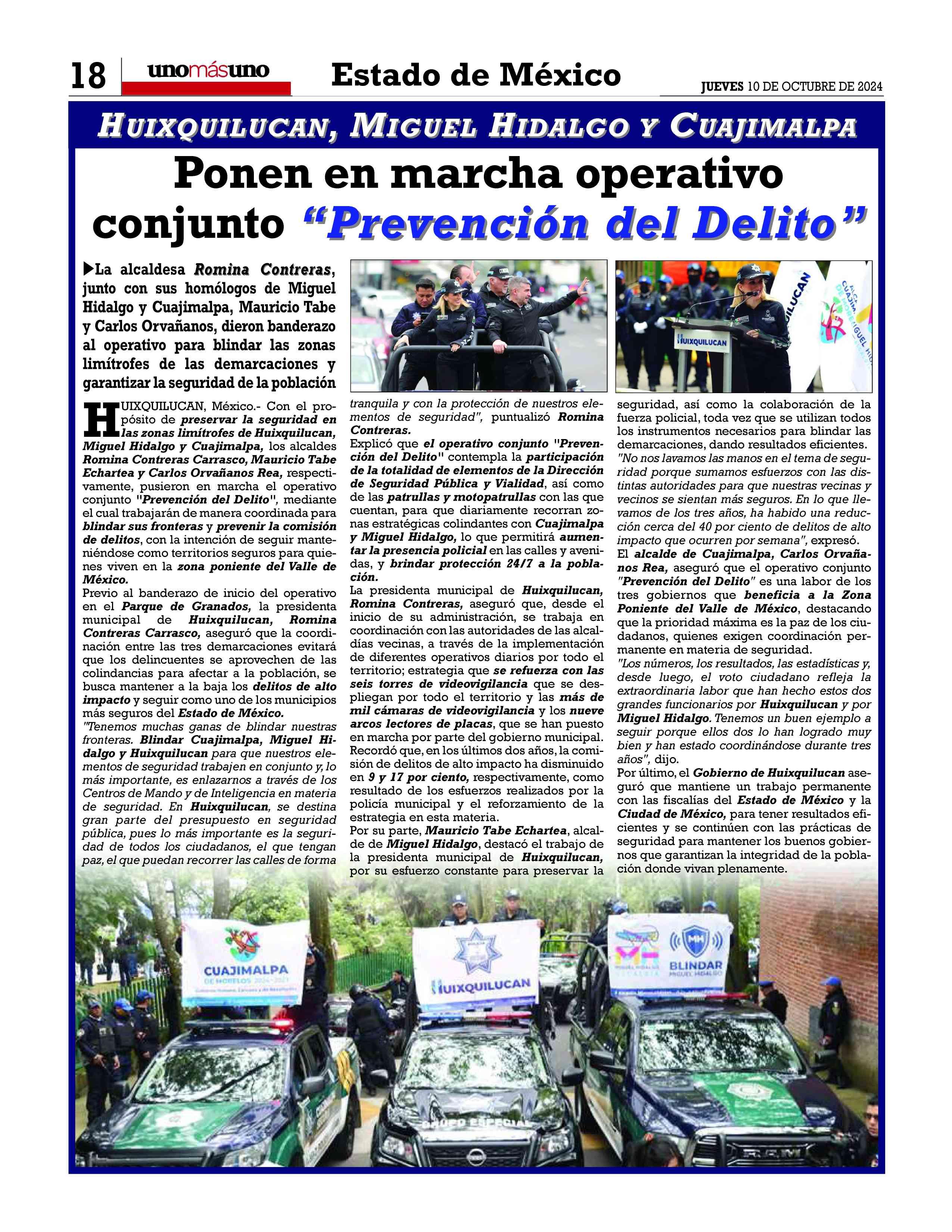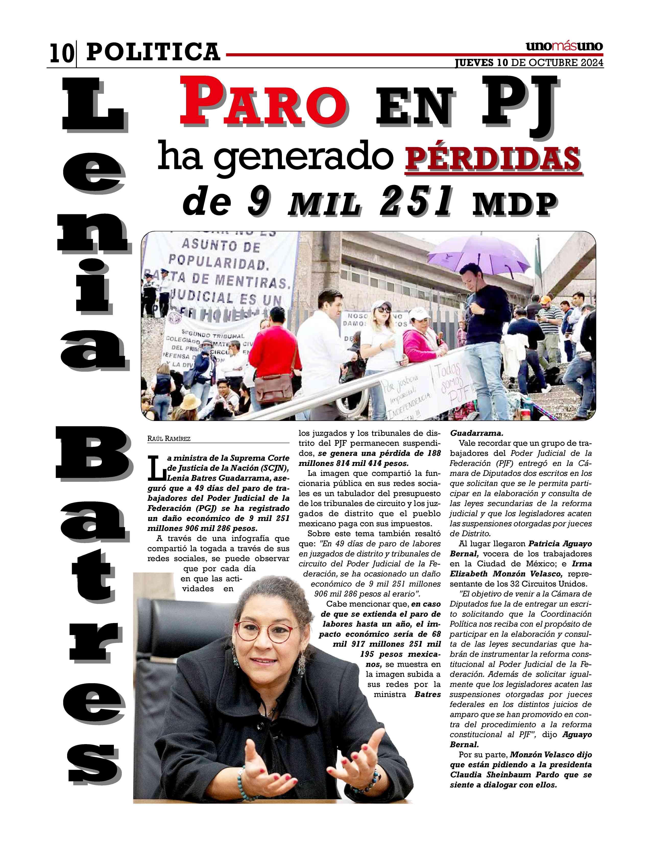AñoXLV-Número16313Jueves10deoctubre2024 UNOMÁSUNONACIONAL.EditorResponsable:NAIM LIBIENKAUI.Publicacióndiaria,editadaydistribuidaporLIBIEN &SON’SSAdeCVentalleresdeGabinoBarreda86bis.Col.San Rafael,CiudaddeMéxico,C.P.06470,DelegaciónCuauhtémoc TeléfonoCDMX:55/10555500.Ext.Redacción102-103y105, PlantaToluca017221340000Ext.116. Losartículosynotaspublicadosenesta edición,sonresponsabilidaddequienlosfirma.