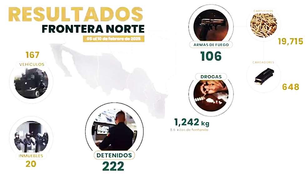Más de 63 mil cartuchos útiles,cargadores y armas de fuego han sido decomisadas por autoridades federales en el marco del Operativo Frontera Norte, las que también han incautado 10 toneladasdediversasdrogas,entreellasfentanilo y metanfetaminas.Las acciones se han apegado estrictamente a lo establecido a la ley y respeto a los derechos humanos.