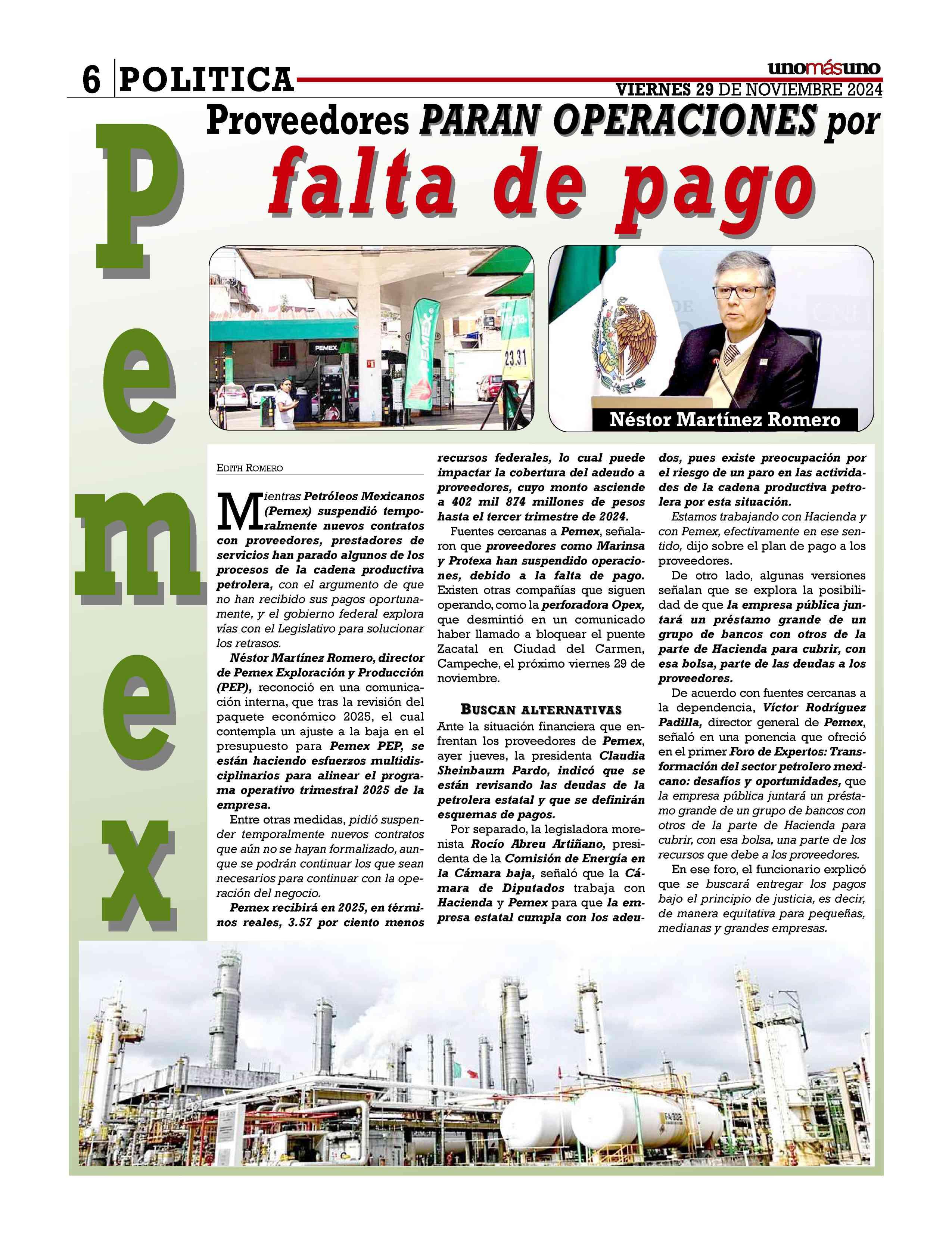 el Presupuesto de Egresos 2025 se asignan 136 mil millones de pesos a la refinería Dos Bocas, la cual se ha mostrado opaca en sus finanzas y, según investigaciones periodísticas, prolifera el reparto de contratos de alta magnitud a cercanos y a amigos del anterior Ejecutivo Federal.