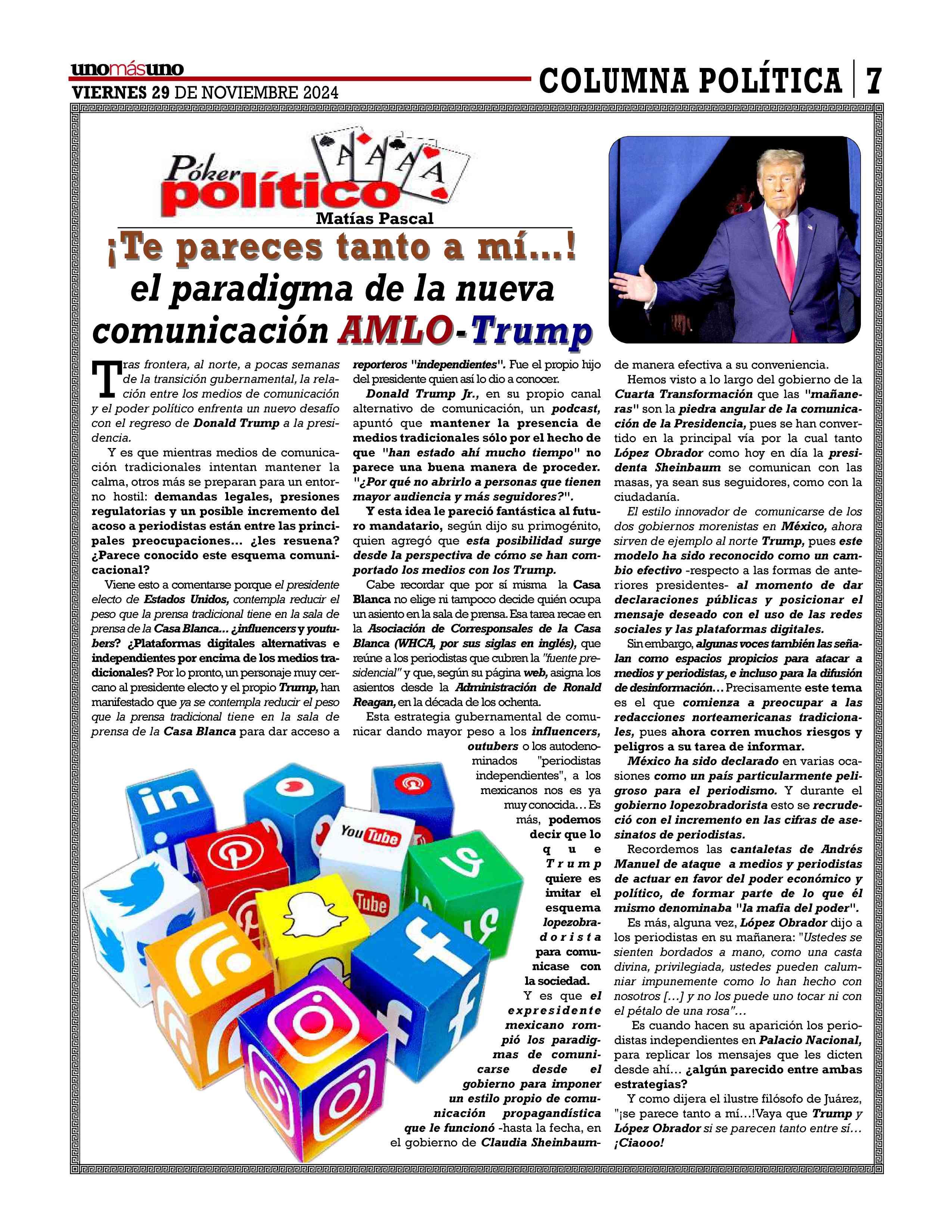 surge como el síndrome de Estocolmo hacia la imagen y las acciones de gobierno), la aplicación discrecional de lo recaudadoesuntemaquenoshallevado a la situación que vivimos hoy, las cosas de interés nacional son tocadas, abordadas,yplaneadas de una maneramuy por encima,parece que sólo se trata de no cometer errores, cuando queremos gobierno que nos impulse, que se arriesgue,es más,que hasta pida prestado para el verdadero impulso económico,social, elpaísseempiezaaendeudar nuevamente, las calificadoras consideran que los temas emanados de las reformas políticas no pintan un buen panorama para una calificación positiva, la inversión extranjera pausada por incertidumbre legal, no son buenos ingredientesparaestemomentotanvolátilpor los conflictos bélicos en Medio Oriente, en Rusia, Ucrania y las repercusiones que esto tendrá en el futuro muy cercano,eso,aunadoalapolíticaescandalosa del ganador a la presidencia de Estados Unidos (DonaldTrump), quien en su habitualtonoamenazador nosdice: que nos subirá los aranceles por exportación, en una guerra de poderes entre los integrantes del Tratado de Libre Comercio de América del Norte T-MEC antes TLC,