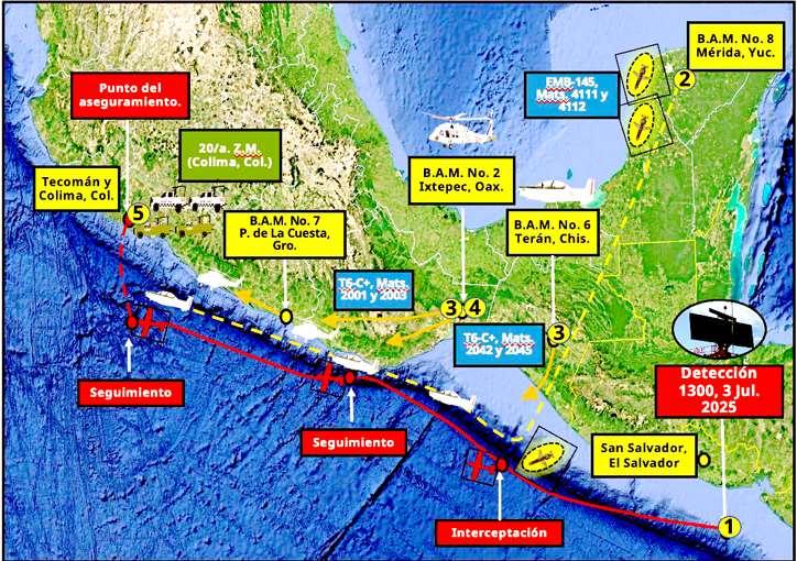 1. 1. Derivado de labores de vigilancia y protección del espacio aéreo mexicano, personal del vigilancia del espacio aéreo detectó, a las 13:00 horas del 3 de julio de 2025,una traza de interés a 200 km al sur a la altura de San Salvador, El Salvador, como puede apreciarse en la gráfica de seguimiento de la aeronave.