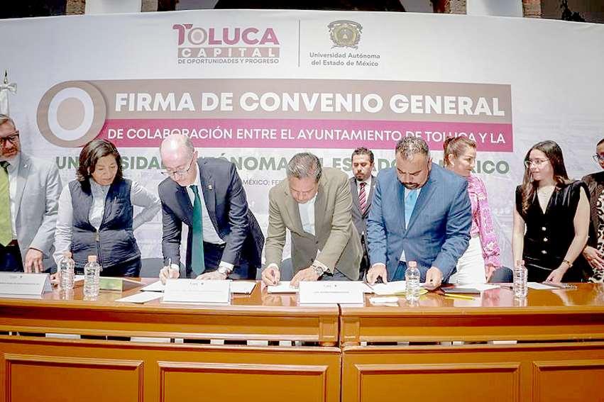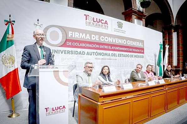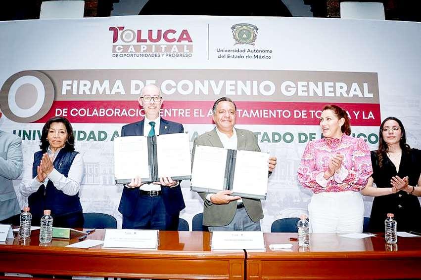 En aras de fortalecer la relación entre el Ayuntamiento de Toluca y la Universidad Autónoma del Estado de México (UAEM),y generar oportunidadesde desarrollo para los estudiantes universitarios, se firmó un convenio de colaboración entre ambas instituciones con el firme compromiso de seguir trabajandode lamano para construirunacapital más justa,humana,cultural y próspera.