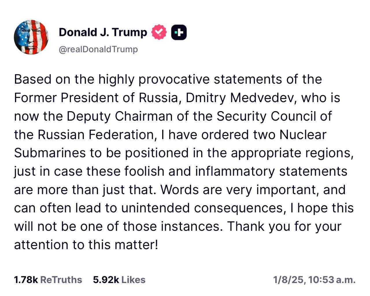 El presidente de Estados Unidos, Donald Trump, ordenó el pasado viernes el despliegue de dos submarinos nucleares en aguas cercanas a Rusia, como reacción directa a recientes declaraciones del expresidente ruso Dmitry Medvédev, quien insinuó la posibilidad de un ataque nuclear por parte de Moscú si el conflicto en Ucrania escala más allá de sus fronteras. Enun mensajepublicadoensu red socialTruthSocial,Trump justificó la movilización como una medida de precaución ante lo que calificó como "insensatas e incendiarias declaraciones" provenientes del entorno del Kremlin "Por si acaso estas insensatas e incendiarias declaraciones son algo más que eso", escribió el mandatario estadounidense, sin ofrecer más detalles sobre la ubicación específica de los submarinos o los plazos del operativo.